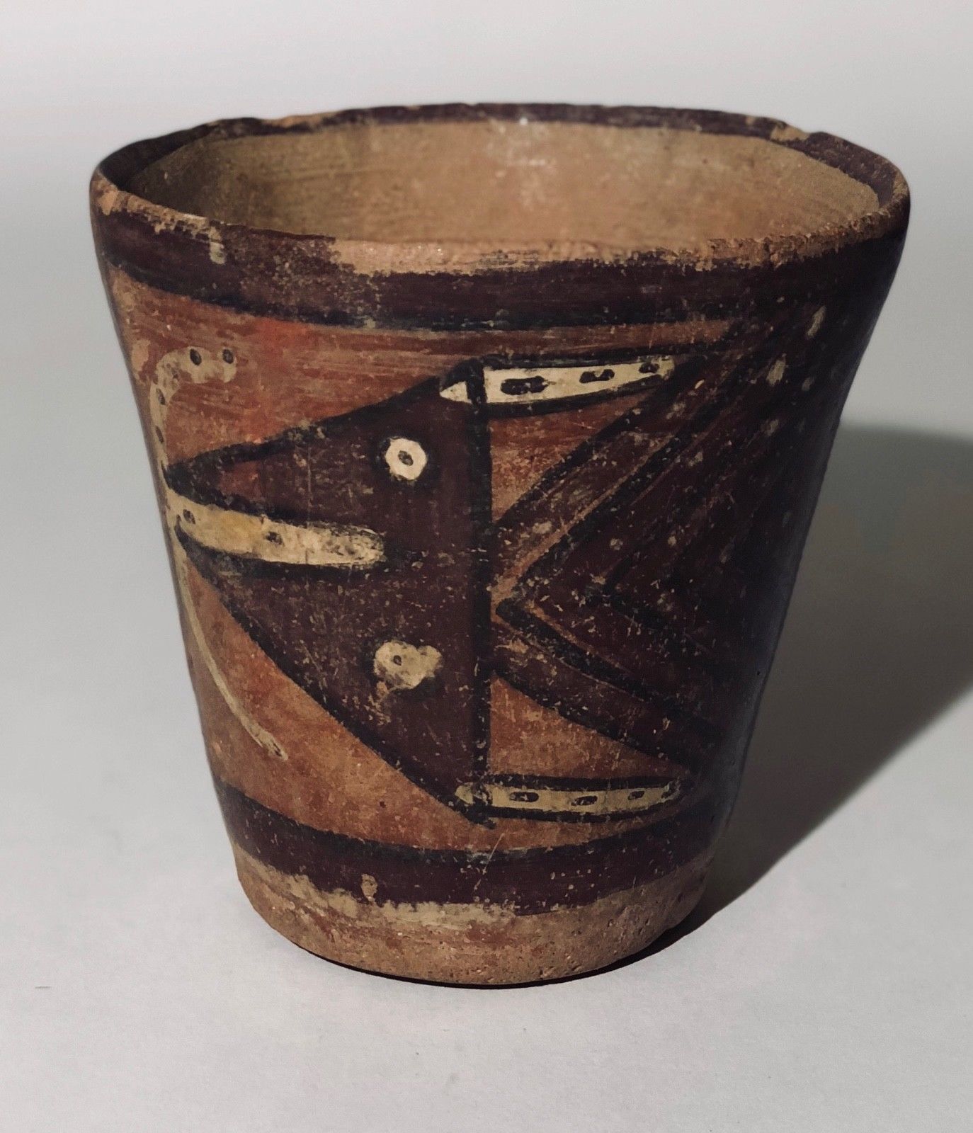 This is a Pre-Columbian Wari kero (drinking cup) is painted and made from clay. It comes from what is present-day Peru, and it dates from c. 600-900 CE. Painted in shades of purple, orange, white, and black, this cup has a highly stylized zoomorphic design that repeats is on both sides. It could depict an abstract representation of marine animals, like a squid or fish, or possibly an avian motif.