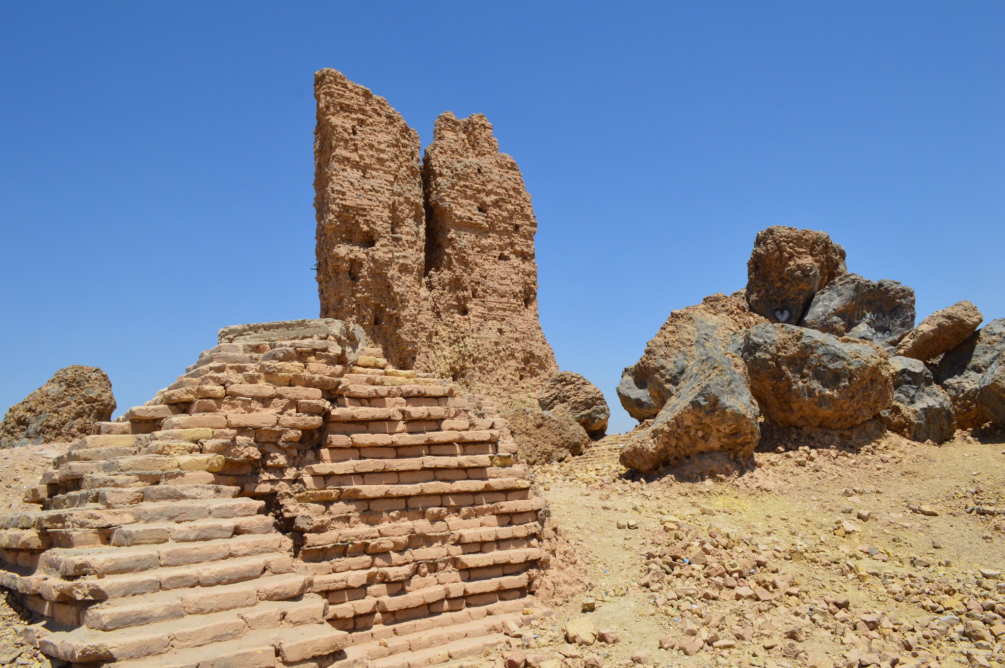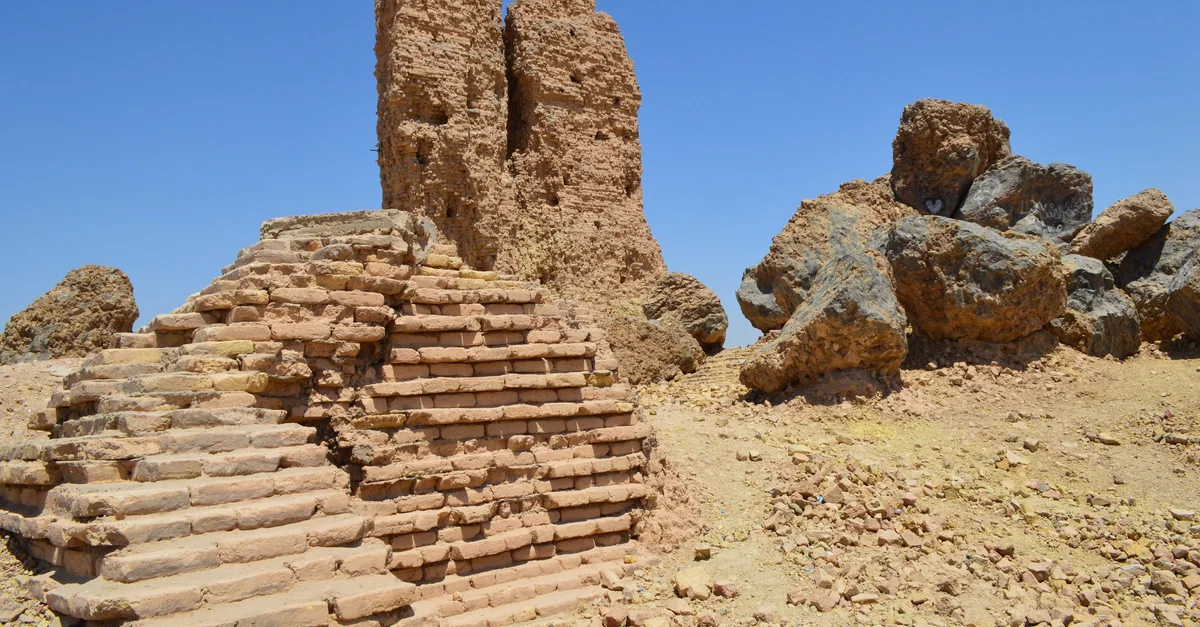 The so-called "tongue tower" lies at the top of the ruins of the ziggurat and temple of Nabu at the ancient city of Borsippa, in modern-day Babel Governorate, Iraq. 6th century BCE.