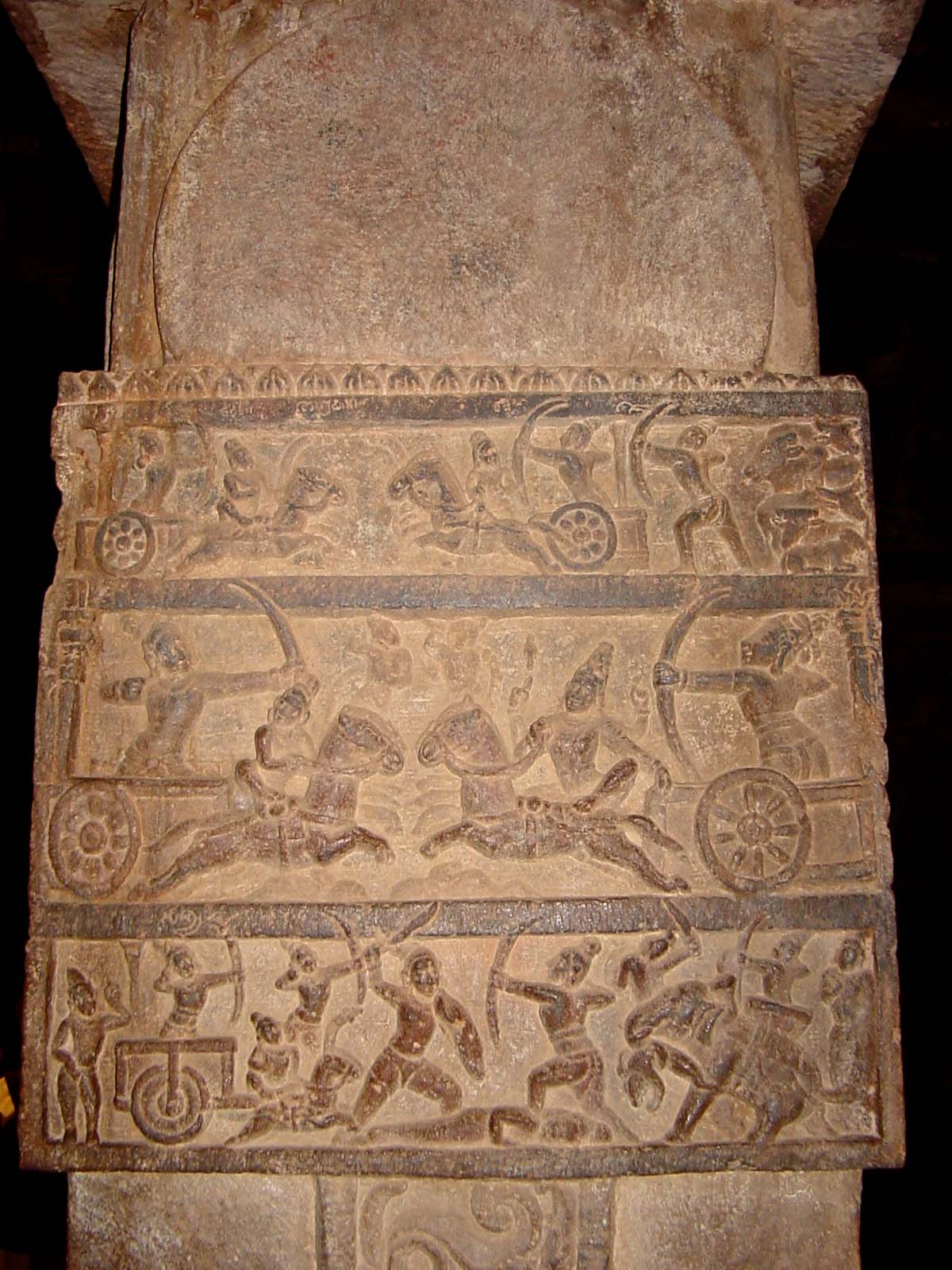 This sculpture made during the period of the Chalukyas of Vatapi (6th century CE to 8th century CE) shows a scene from the Mahabharata. Here, a combat scene involving chariot warriors, archers, swordsmen, elephants, and a fallen combatant is depicted. The chariots are shown with seven-spoked wheels, a flagstaff and a rectangular box with a single archer riding it. Charioteers, virtually sitting on the horses, can also be seen. The warriors are not armoured. The use of chariots in battle had declined long before this period and the Chalukya army did not use them. This is thus a sculptural representation of how the Chalukya artists imagined chariot warfare to have been in the preceding periods of history, particularly in the Epic period where they were much valued. Location: Virupaksha Temple, Pattadakal, Karnataka state, India