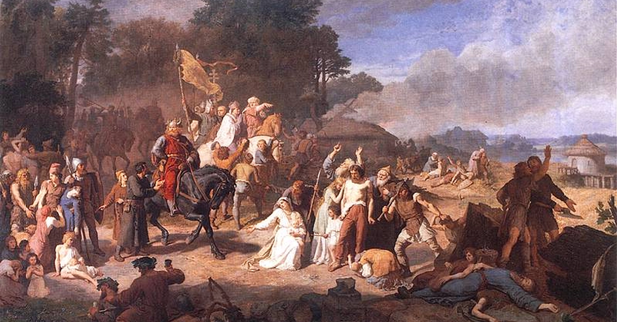 A painting by Wojciech Gerson (1831–1901 CE) of the capture of the pagan Wends (aka Western Slavs) by a Saxon-danish army during the Northern Crusade of 1147 CE.