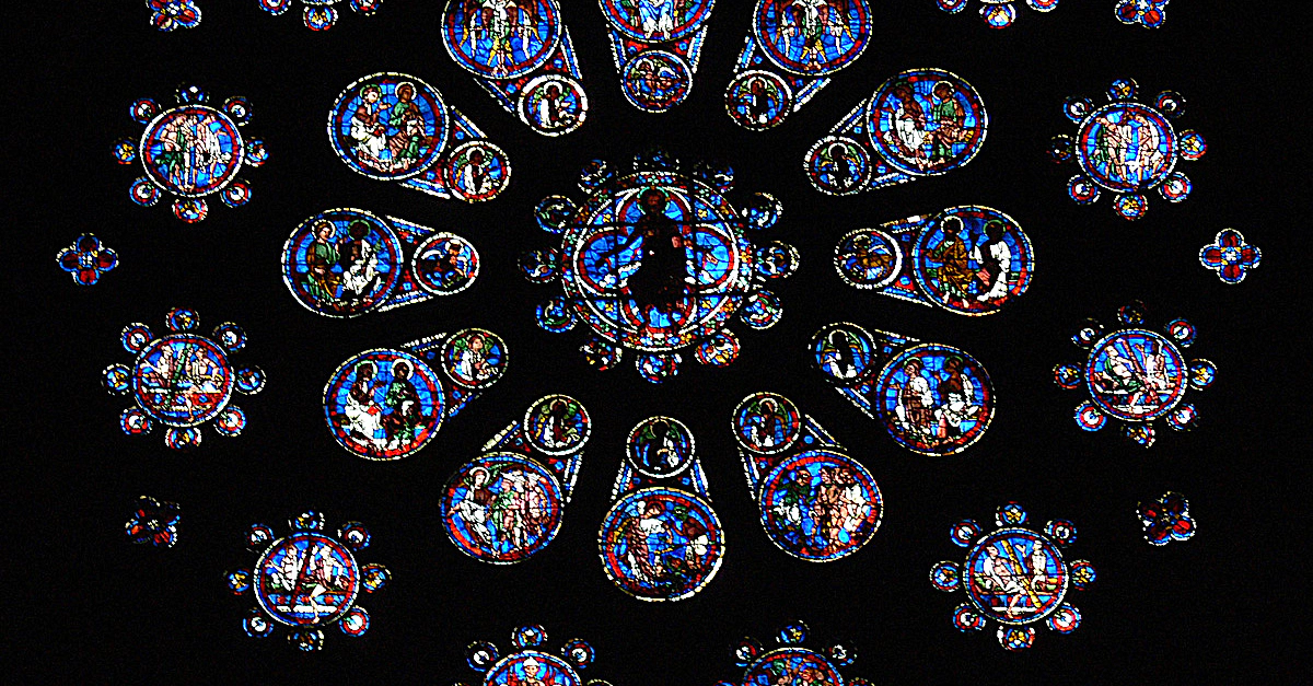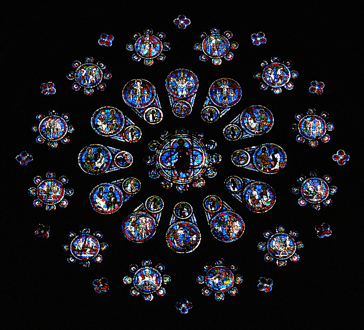 The West Rose window of Chartres Cathedral, France, 1190-1220 CE. The stained glass window shows scenes of Jesus Christ and the Last Judgement