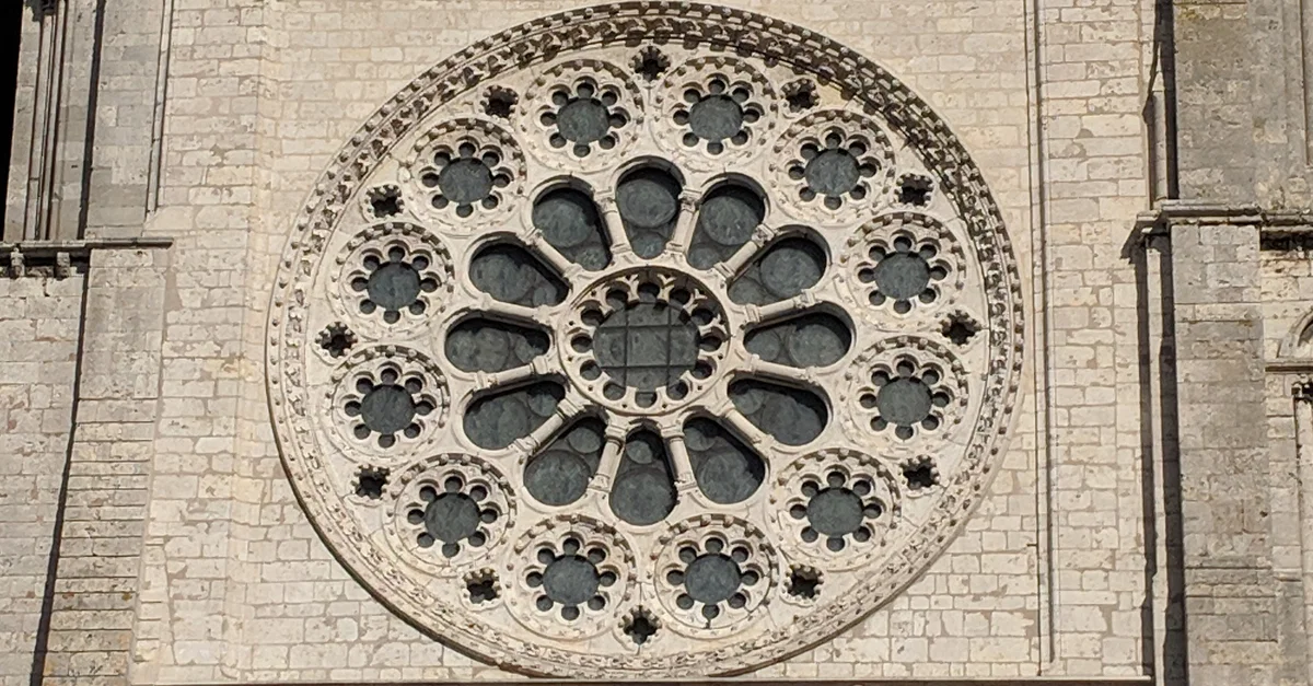 Outside view of the west rose window of Chartres Cathedral, France. The window is situated just above the main entrance or Royal Portal and was installed c. 1215 CE. It measures 15.42 metres in diameter.