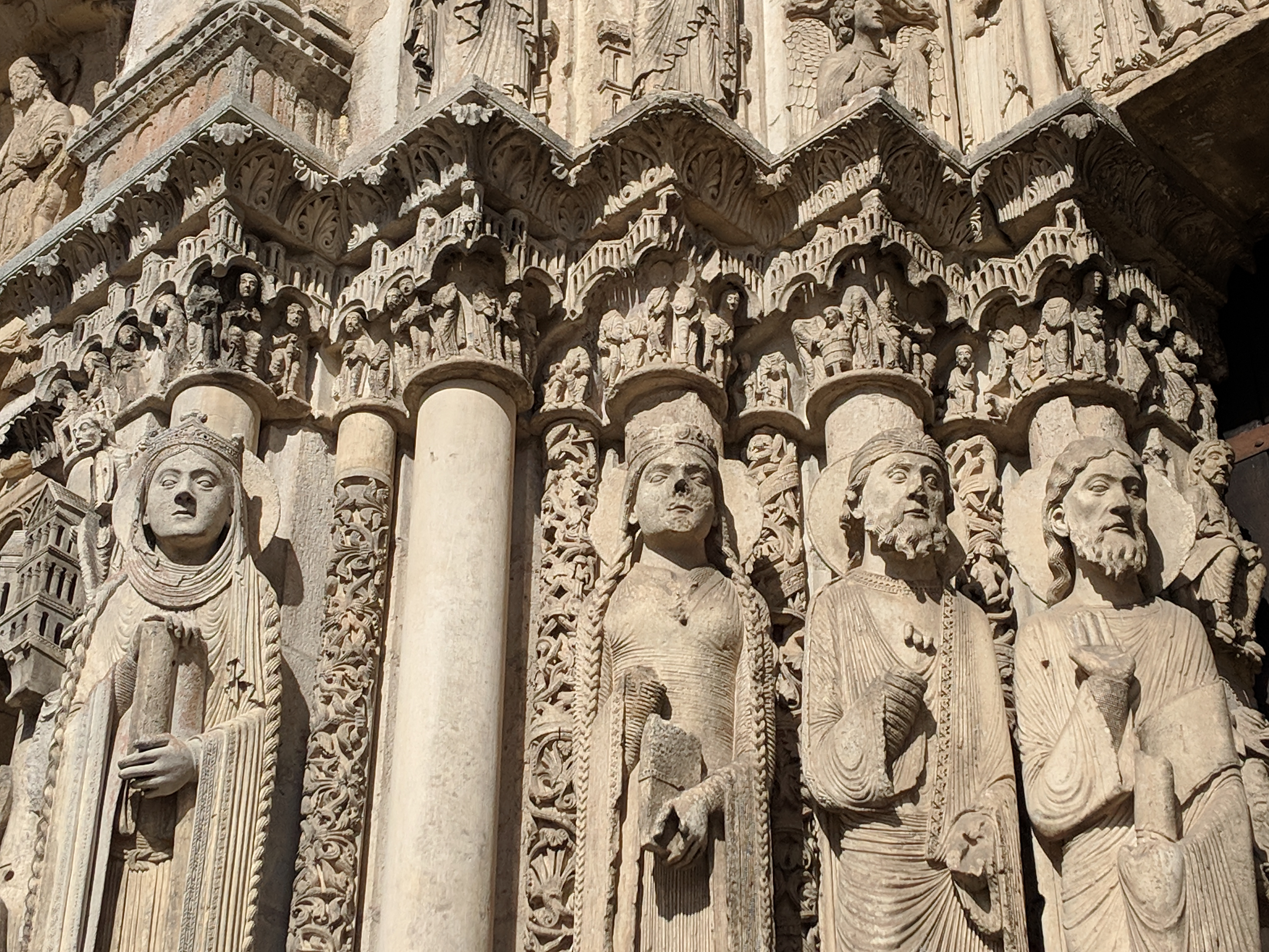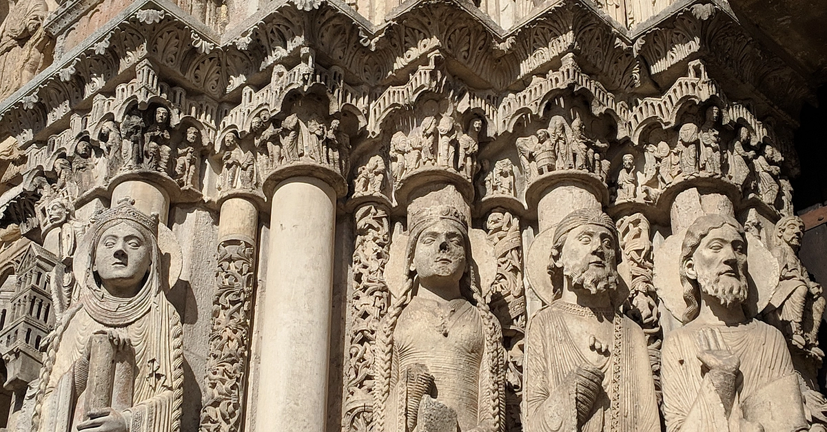 A selection of statues that line the main triple entrance, the Royal Portal, of Chartres Cathedral, France. The statues depict a variety of professions, from kings to paupers. 1145-1155 CE.