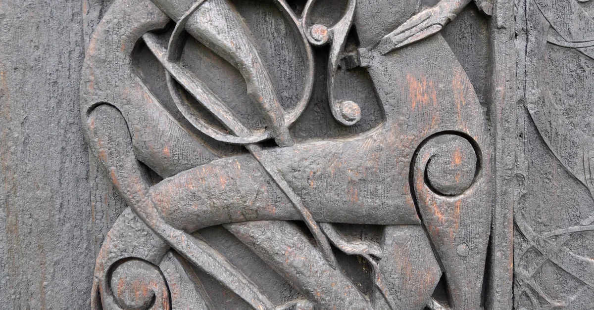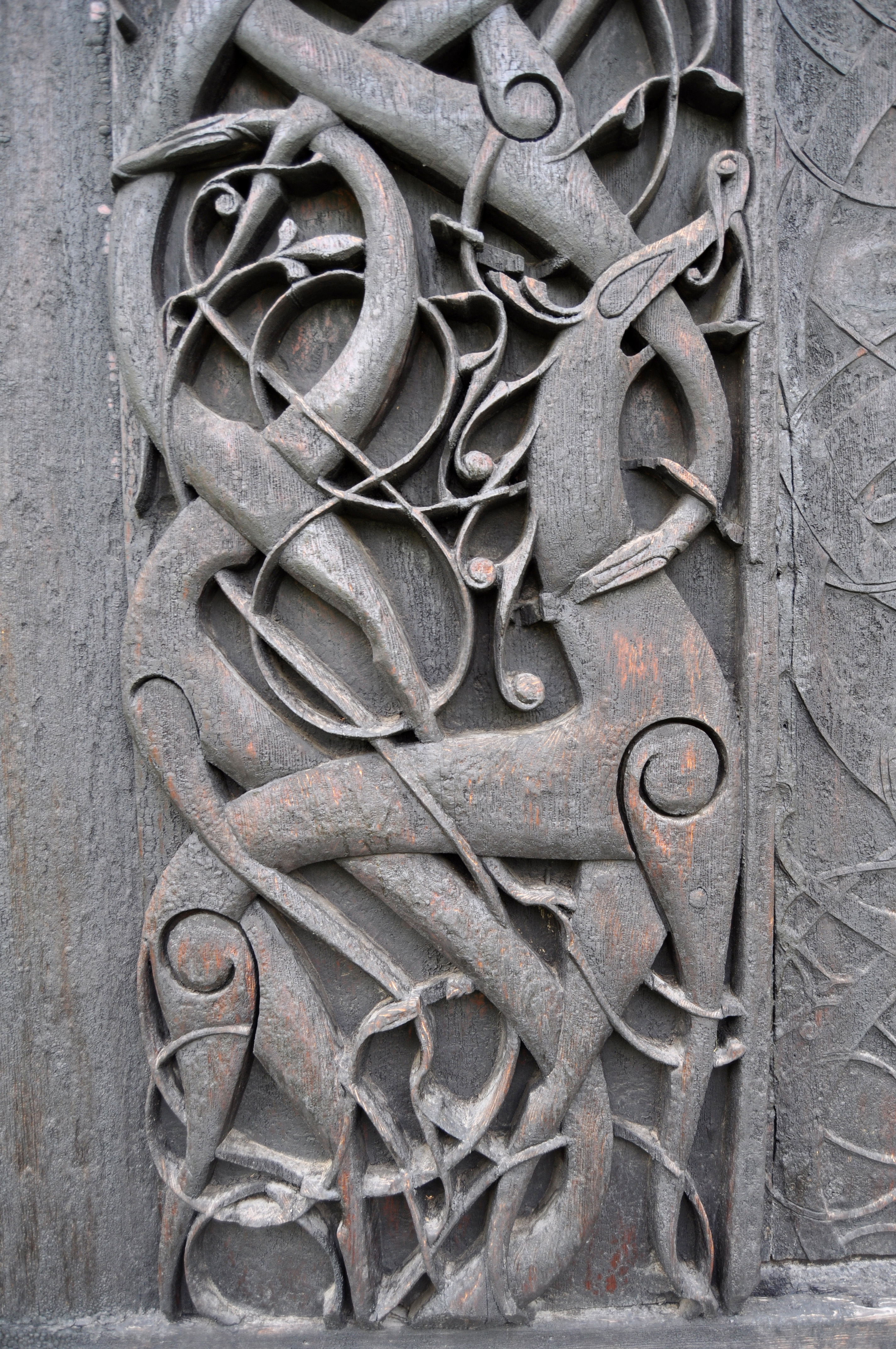 Detail of a wooden panel from the portal of the stave church at Urnes, Norway, which is decorated in the eponymous Urnes style animal ornamentation. The last of the animal ornamentation styles of the Viking Age, the Urnes style featured very elegant motifs of great beasts and interweaving loops and tendrils. It was popular from c. 1040 until at least 1100 CE, also in Viking colonies such as the one in Ireland.