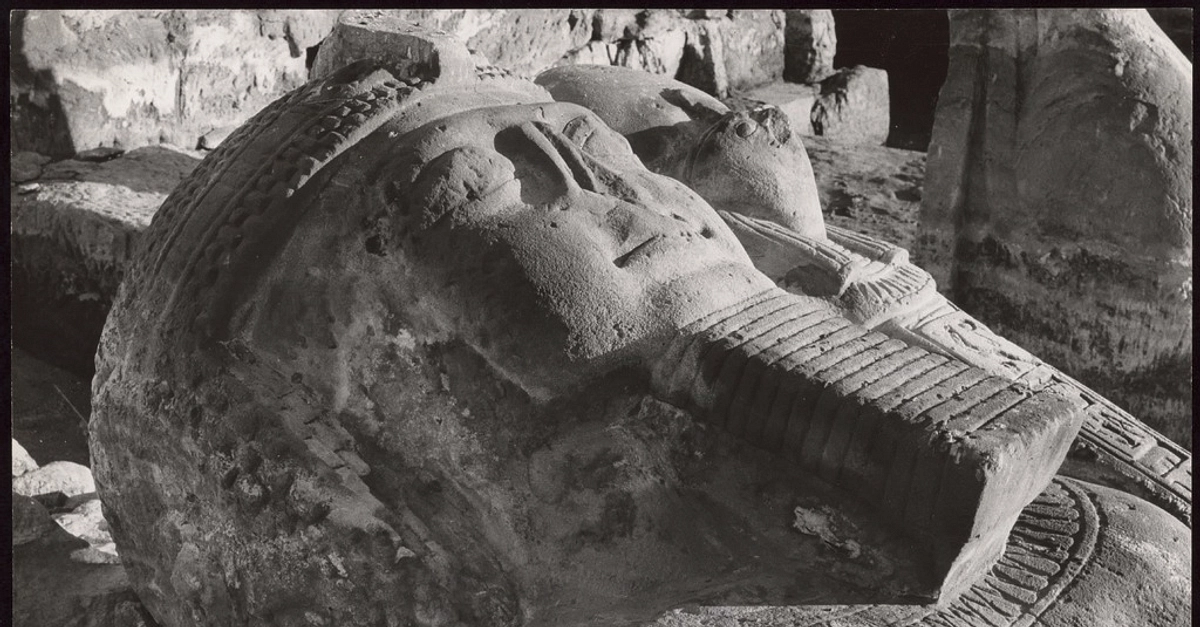 Wadi es Sebui (94 miles north of Aswan, left bank). Temple of Amon Ra and Ra Horakhti built during the reign of Rameses II (1290-1223 BCE). The fallen head of a colossus lies before the pylon of the temple. The statues, sphinxes and reliefs could be moved to a museum. Wadi es Sebui, Nubia, Egypt (1960)
