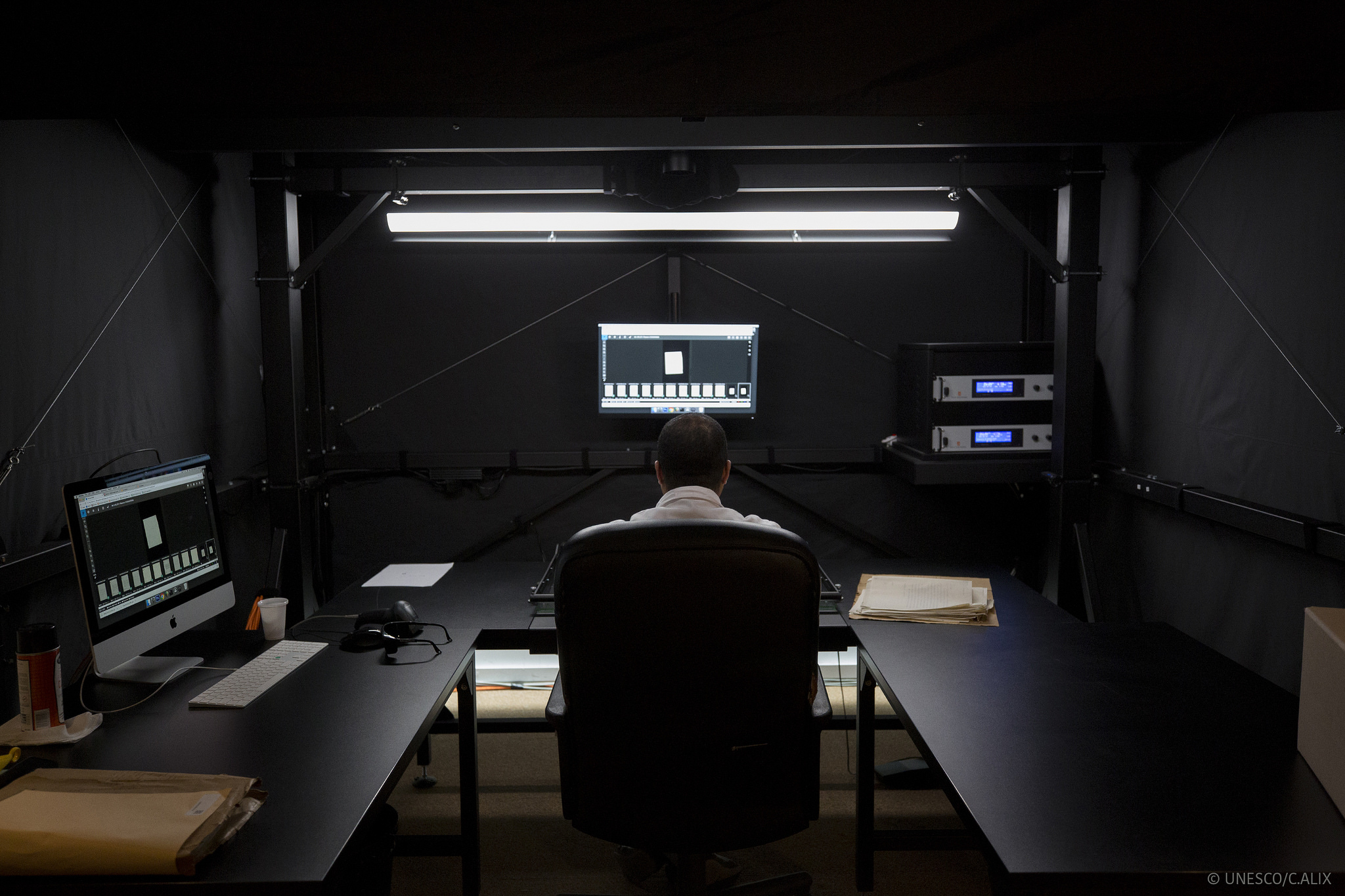 A rare view into the workspace of a member of the UNESCO Digital Archives team.