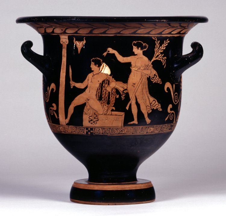 Red-figured bell-krater (wine bowl) with Orestes at Delphi, pursued by the Furies. Apollo will purify him of the blood guilt of killing his mother. The scene may have been inspired by Aeschylus' tragedy The Eumenides. Made in Puglia, Italy, c. 380-360 BCE.