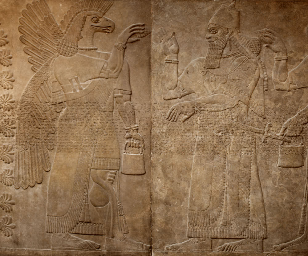 King Ashurnasipal II of Assyira (reigned 883 - 859 B.C.), flanked by eagle-headed protective spirits, of which only the left one is visible in this photo. From Nimrud, North-West Palace. Exhibited in the British Museum London.