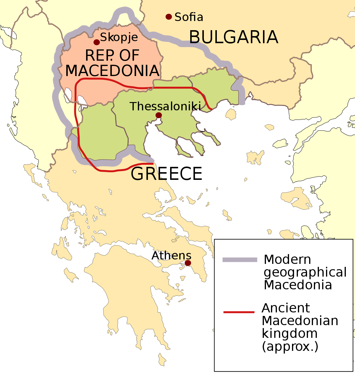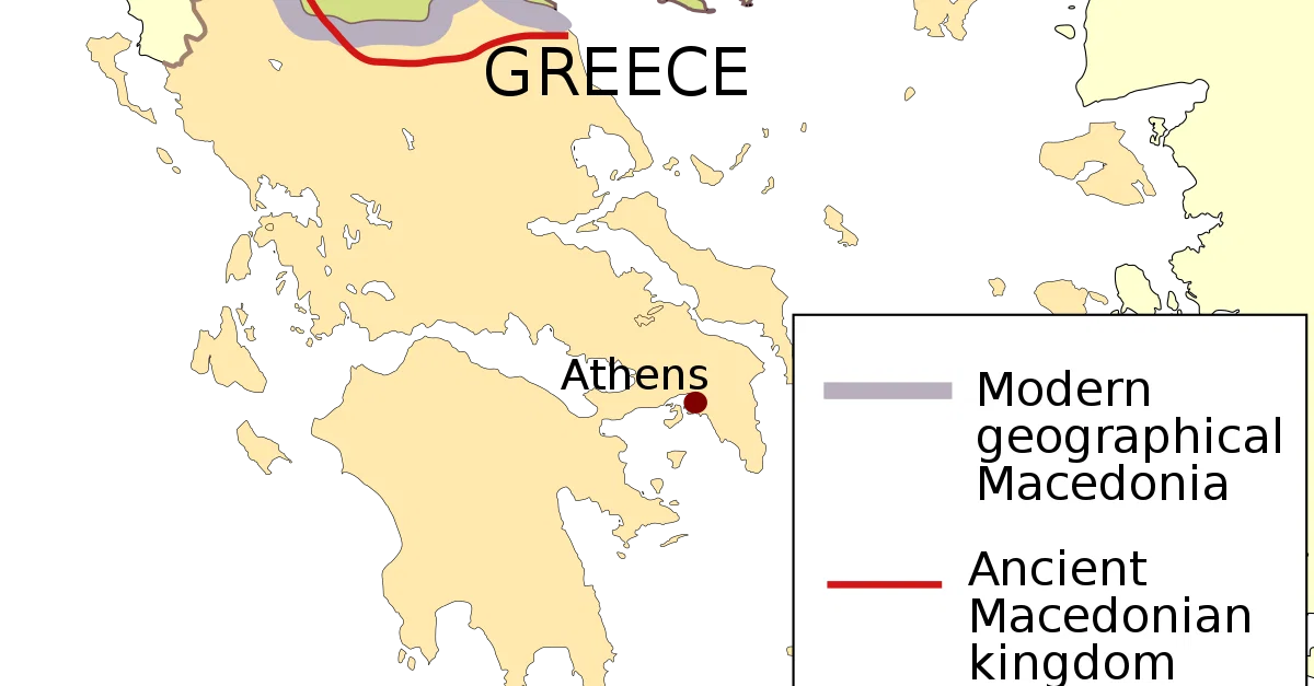 A map indicating the approximate location of the ancient kingdom of Macedon and the modern political entities that area now covers.