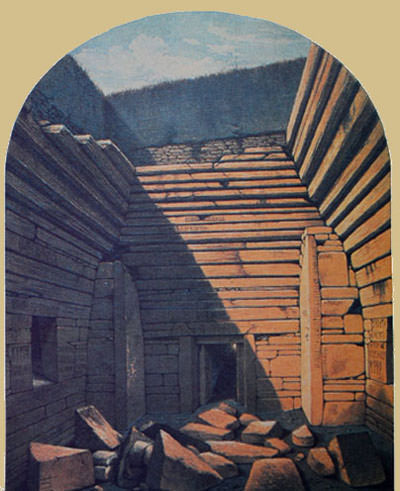 This drawing, by a Mr. Gibb of Aberdeen, Scotland, depicts the state of Maeshowe shortly after the excavation through the roof of the structure in 1861 by the antiquarian James Farrer.