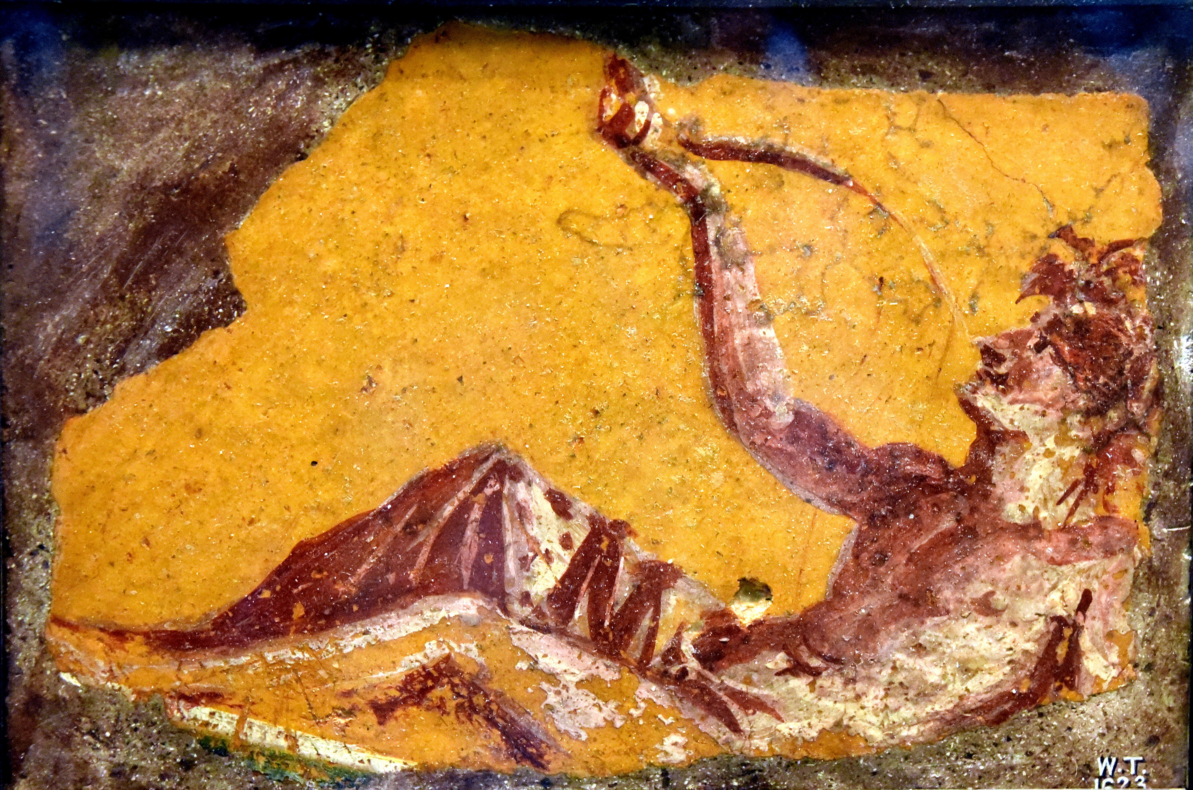 This wall painting depicts a man reclining at a banquet, drinking from a horn. Said to be from near Pompeii, in modern-day Italy. Roman period, 50-79 CE. Formerly in the collection of Sir William Temple (Painting 40). (The British Museum, London).
