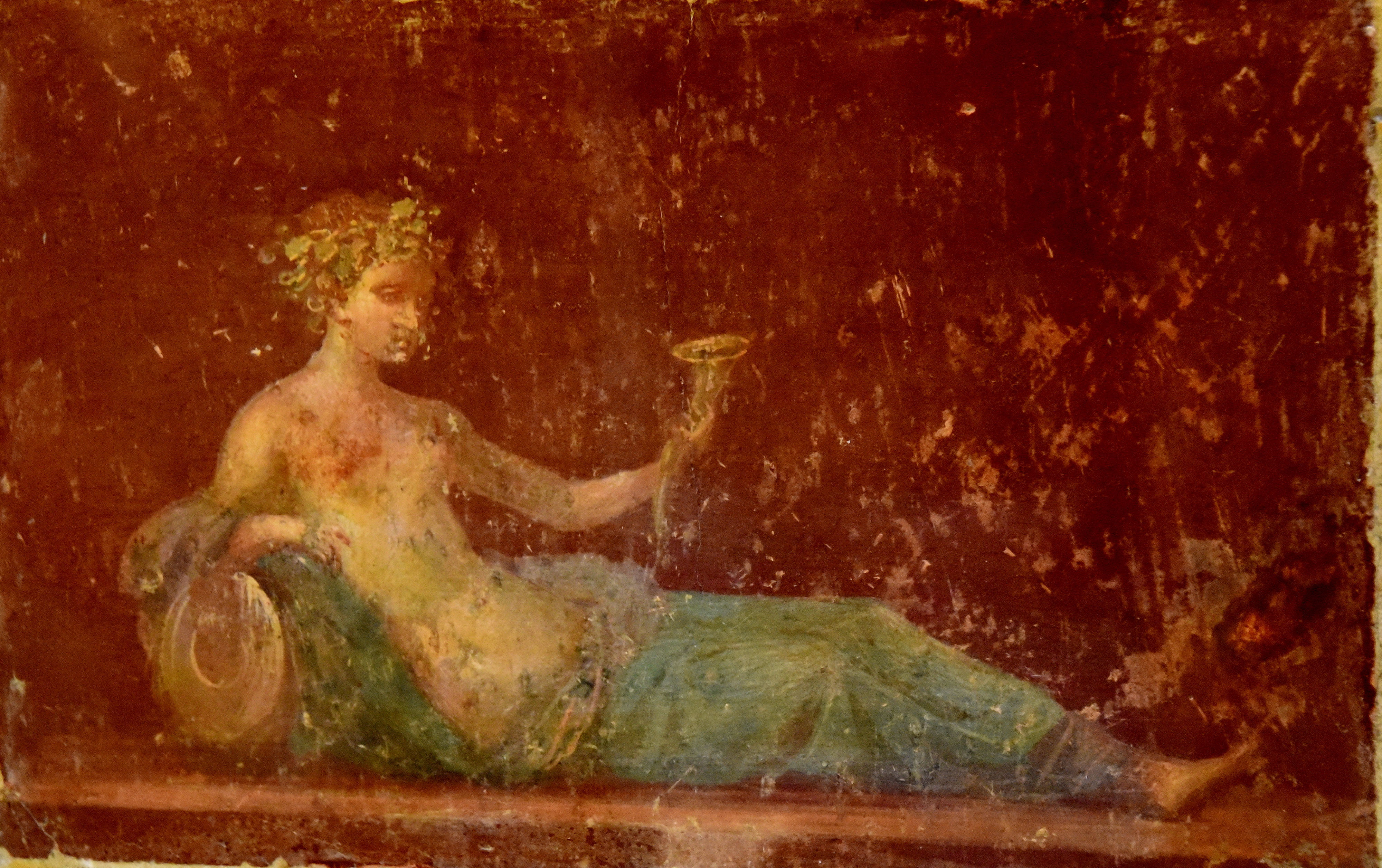 This wall-painting depicts a reclining Naiad (water-nymph), drinking from a horn. This panel adorned the "Red Room" behind the triclinium (dining room) of the villa. A companion panel from the same room is in the Museo Nazionale Archeologico, Naples. From a Roman villa at Campo Varano, Stabiae, in modern-day Italy. Roman period, 30-50 BCE. Blacas Collection (Painting 31). (The British Museum, London).