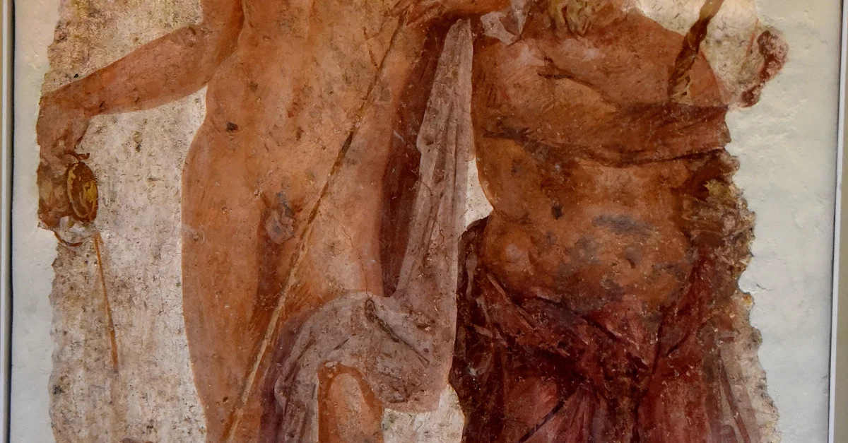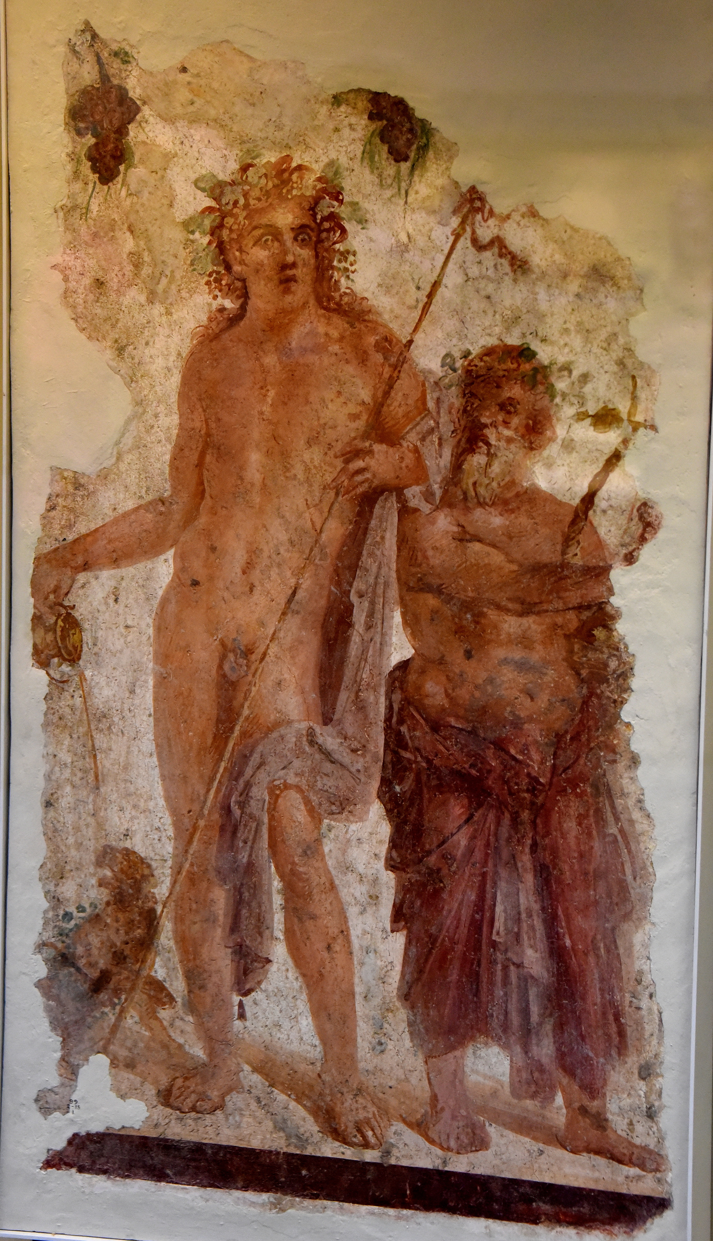This panel from a painted wall depicts the wine-god Bacchus and his companion, Silenus. Bacchus pours wine from a cup for the panther while Silenus plays the lyre. From a villa at Boscoreale, near Pompeii, in modern-day Italy. Roman period, about 30 BCE. (The British Museum, London).