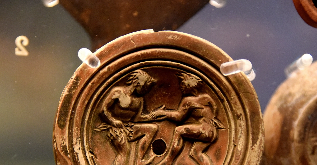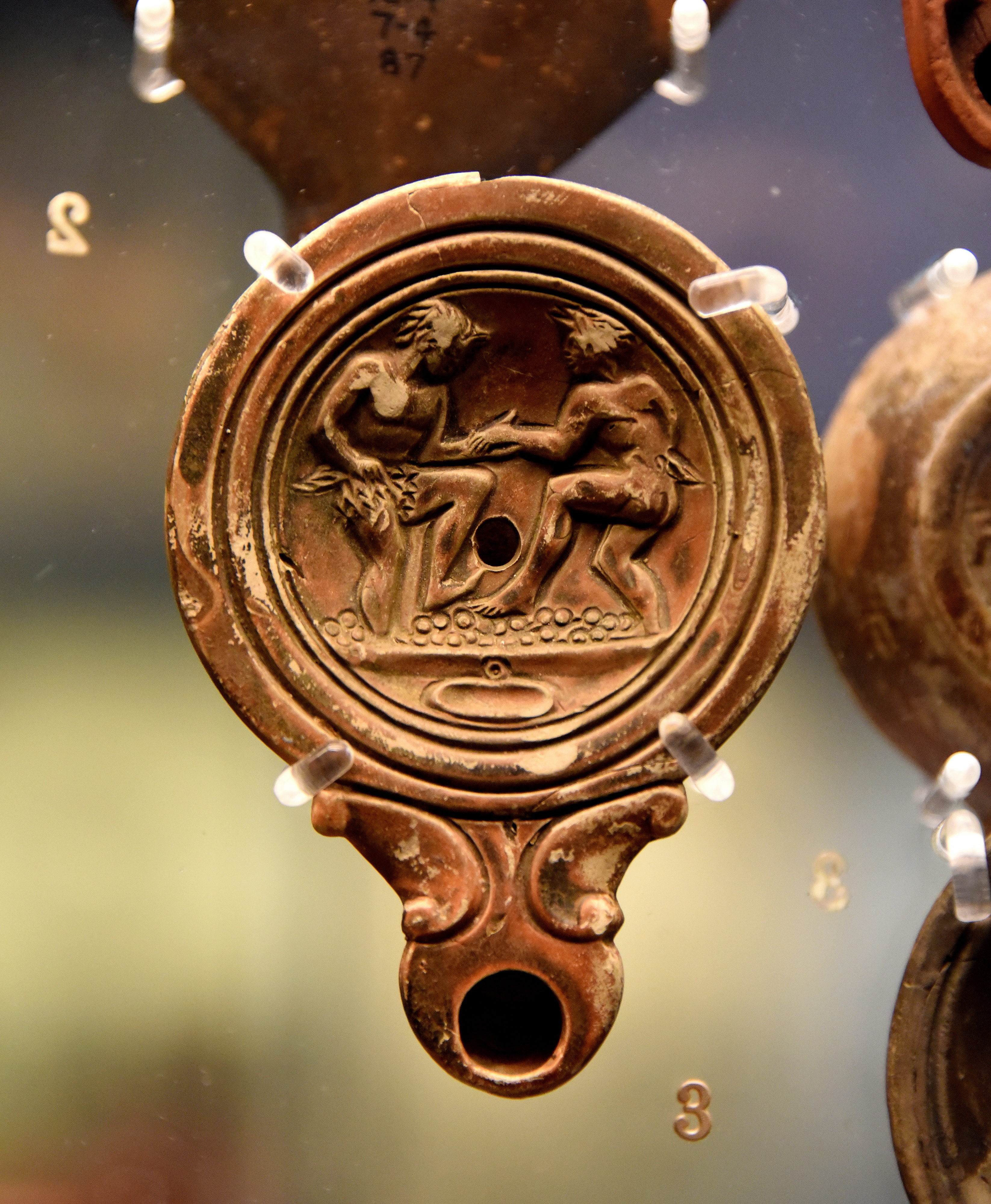 The scene on this terracotta lamp depicts two satyrs treading grapes. From Herpes, France. Roman period, made in Italy, about 40-80 CE. Signed by the maker Gaius Clodius.(The British Museum, London).