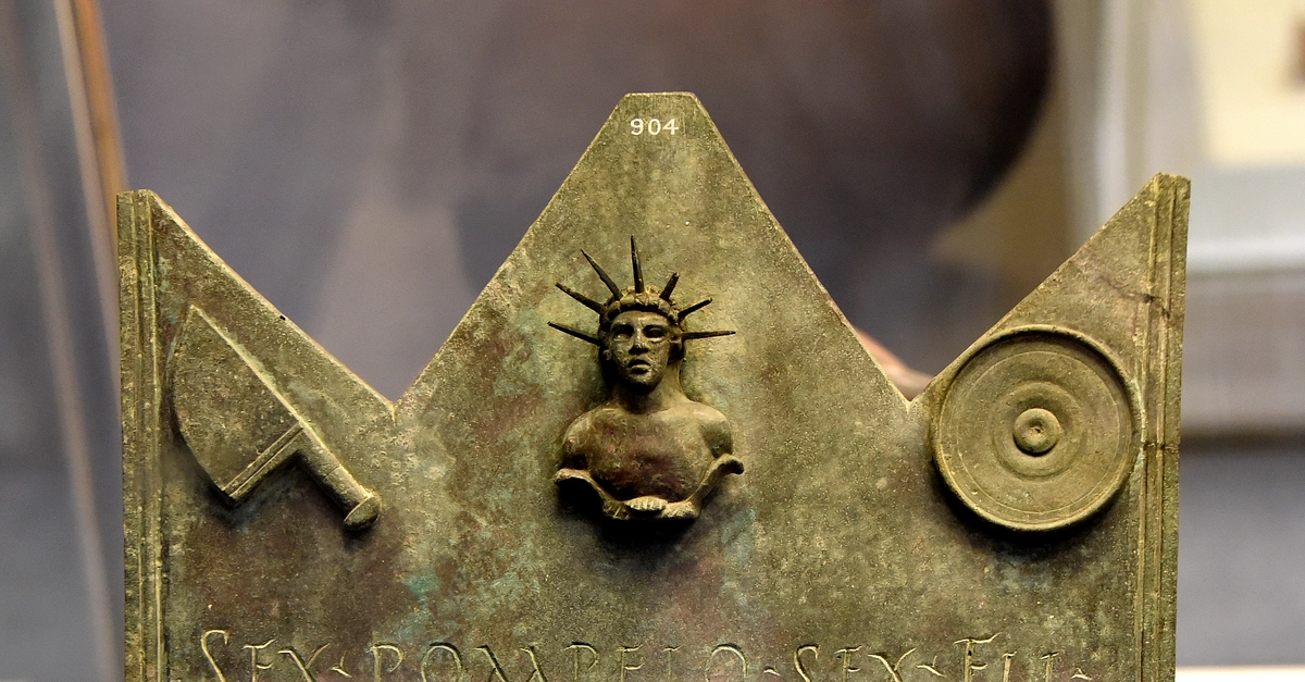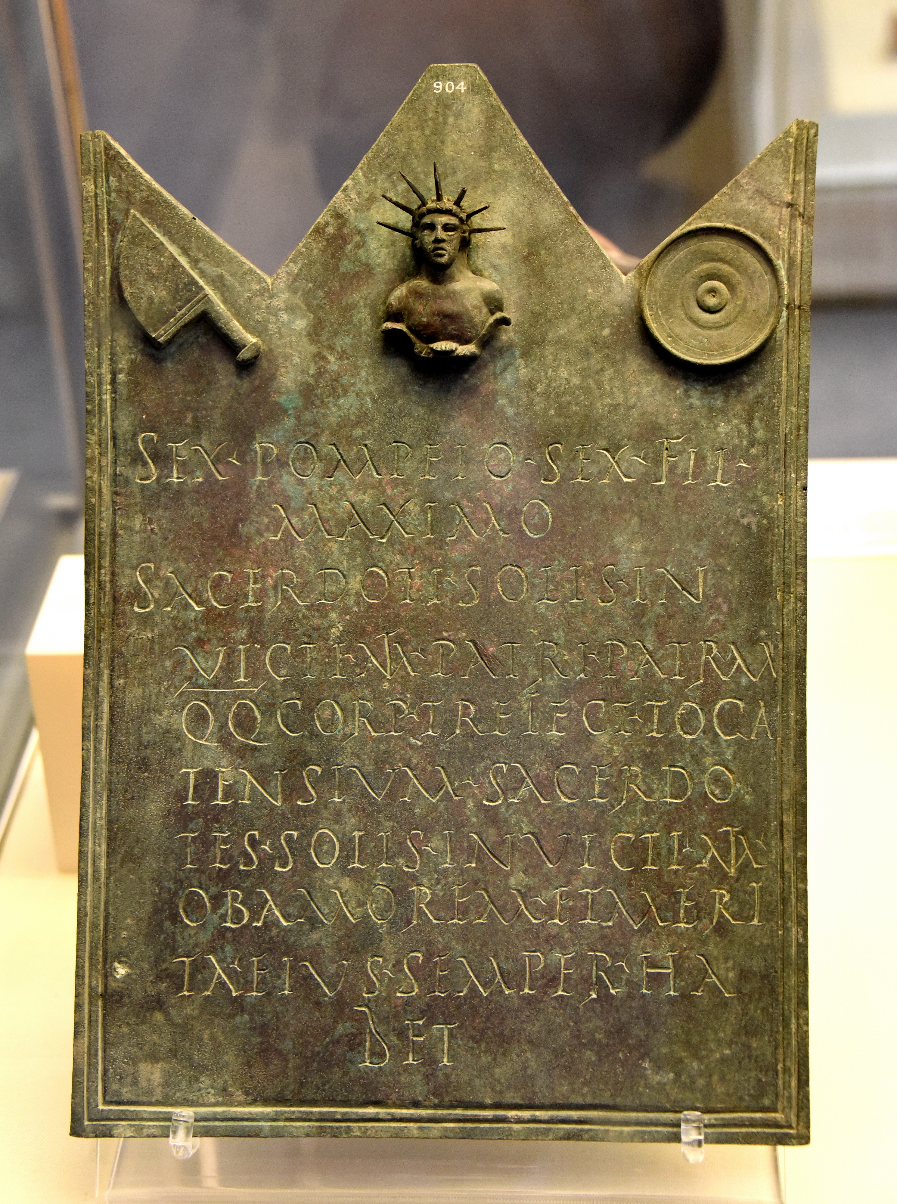 A bronze tablet dedicated to Sextus Pompeius Maximus, chief priest of the cult of Mithras and president of a guild of ferrymen. The tablet was given by fellow priests of Mithras. Above the text are a bust of Mithras, a sacrificial knife, and a patera (libation bowl). Sextus Pompeius is known from another text to have restored a sanctuary of Mithras at Ostia. Probably from Ostia, in modern-day Italy. Roman period, c. 200 CE. (The British Museum, London).