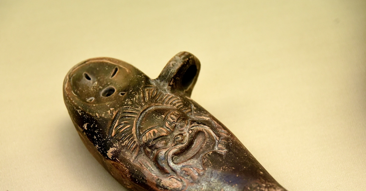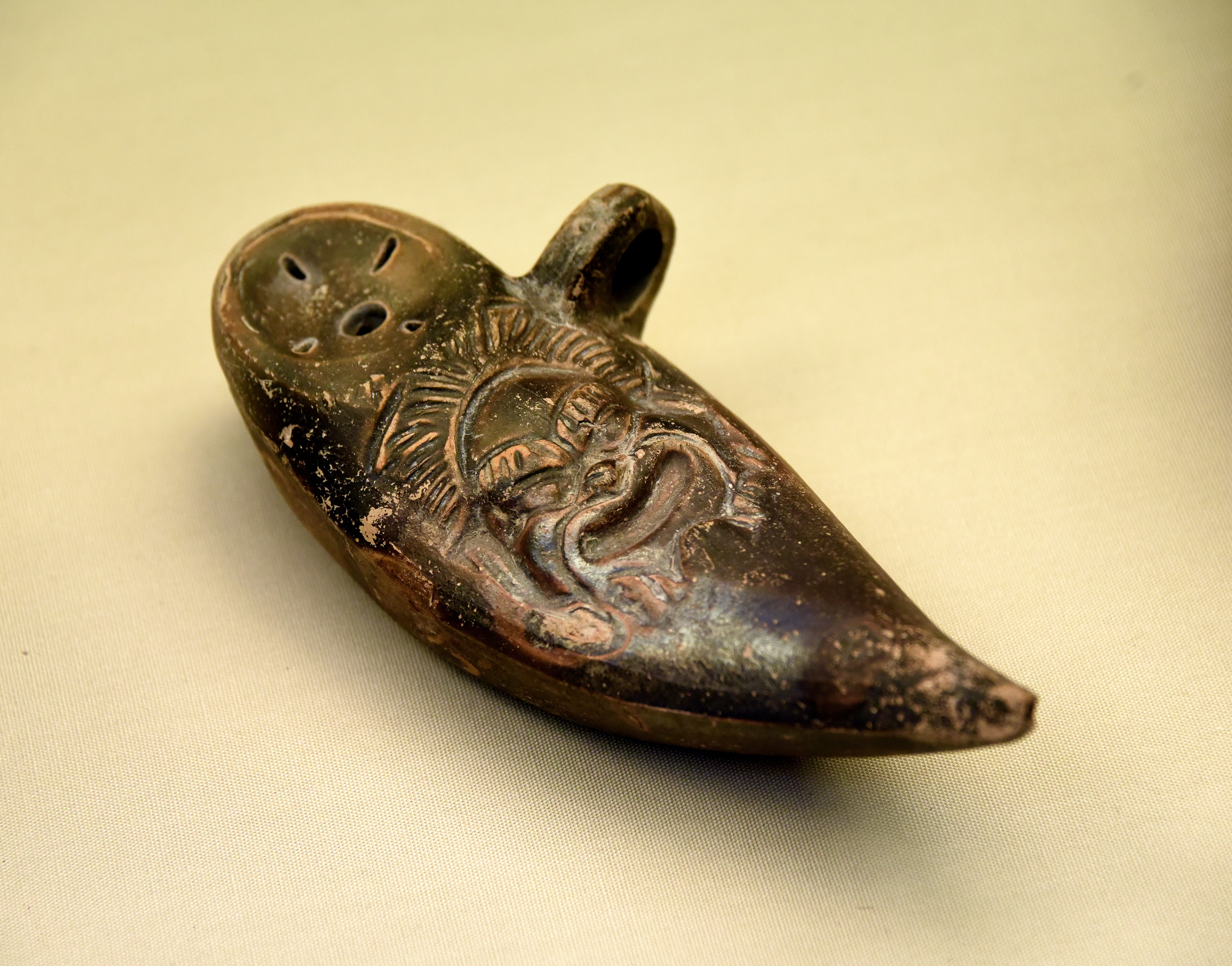 A baby feeding bottle decorated with a dramatic mask. Said to be from Pozzuoli, in modern-day Italy. Roman period, made in Italy, about 1st century CE. Bequeathed by Sir William Temple. (The British Museum, London).