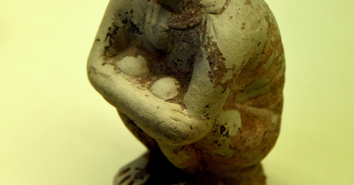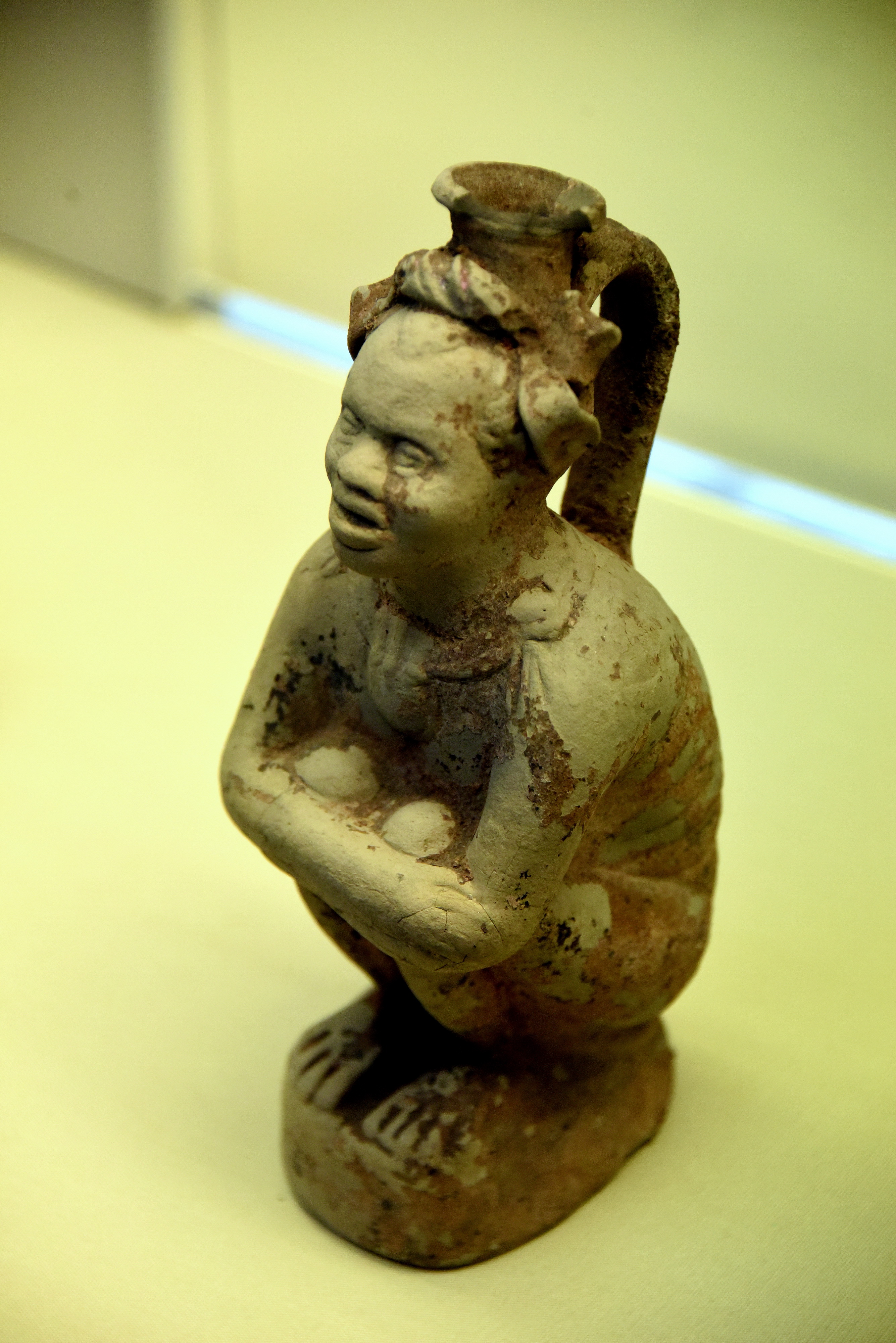 A handled flask depicting a crouching African. Roman period, probably made in Campania (in modern-day Italy) in the 1st century CE. (The British Museum, London).