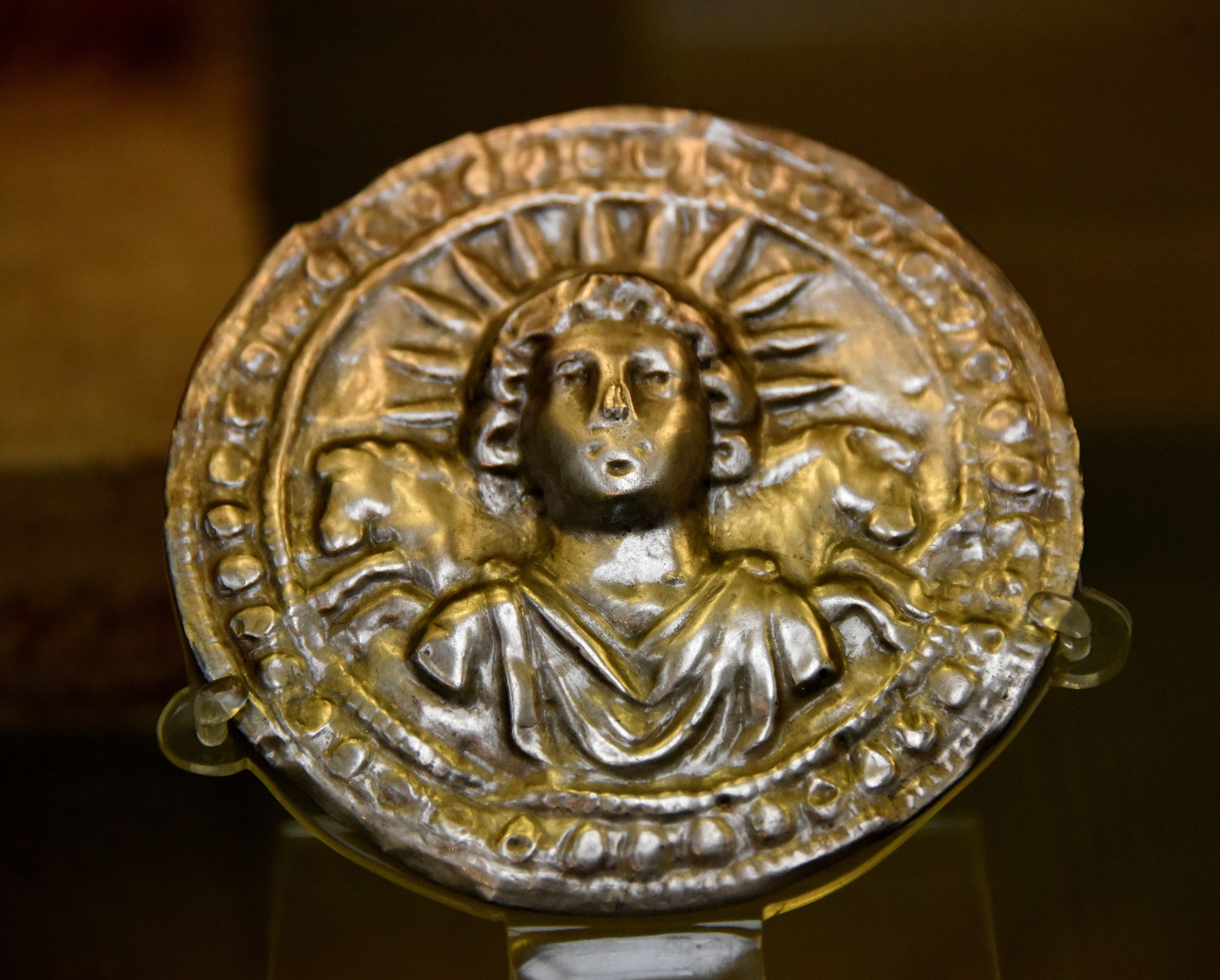 Silver leaf disc dedicated to the sun god Sol. Sol is crowned with rays. Two horses appear behind his shoulders. From Pessinus (Bala-Hissar, Asia Minor), in modern-day Turkey. Roman period, 3rd century CE.