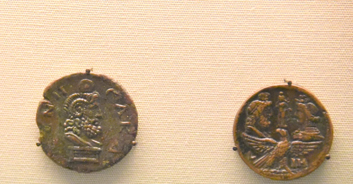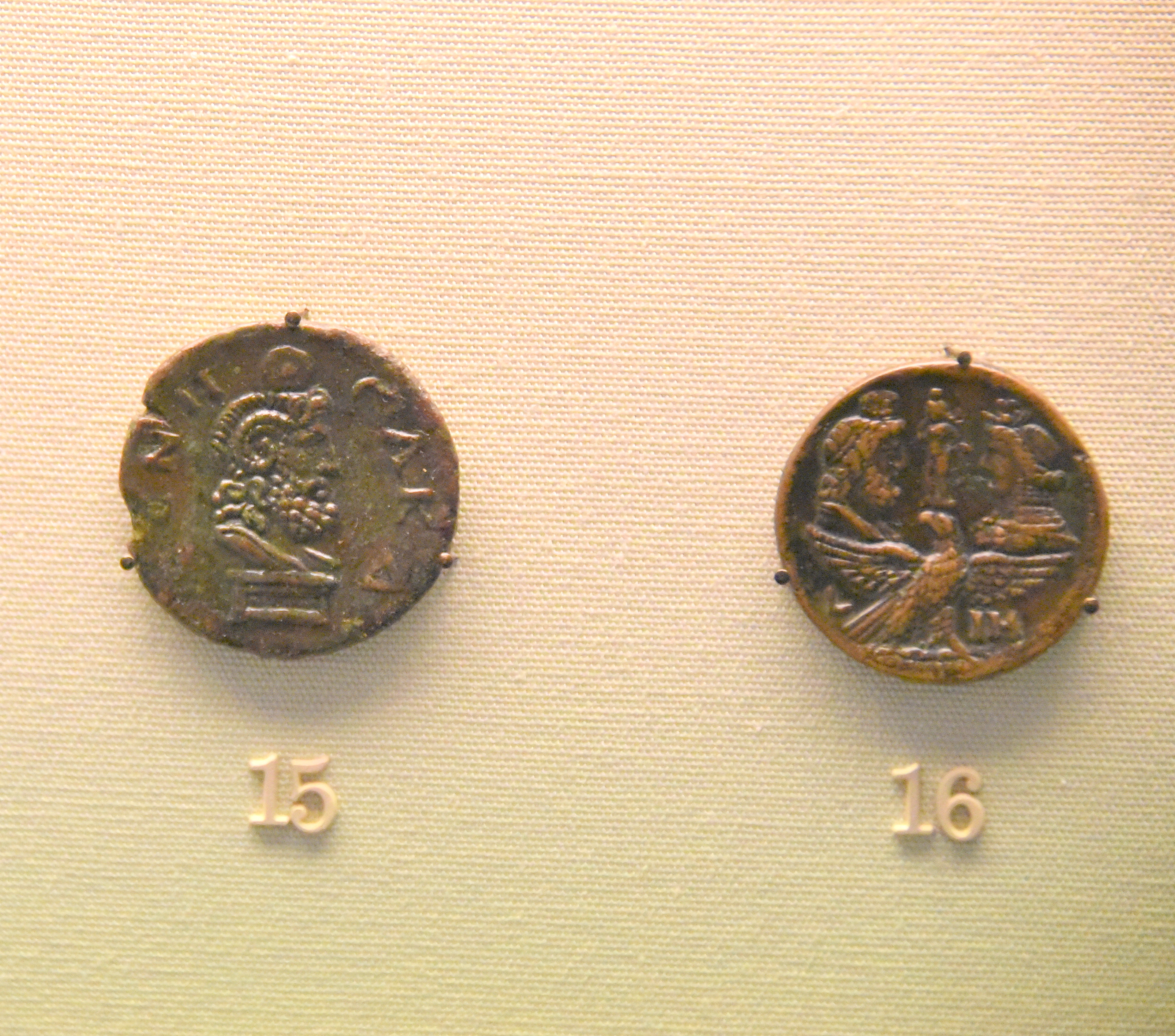 Two silver drachms of Hadrian. The drachm on the left shows Zeus Ammon on a plinth, wearing a ram's horn (c. 134-135 CE) while the one on the right shows busts of Serapis and Isis facing each other, with a small statue of Harpocrates and an eagle (c. 133-134 CE). (The British Museum, London).