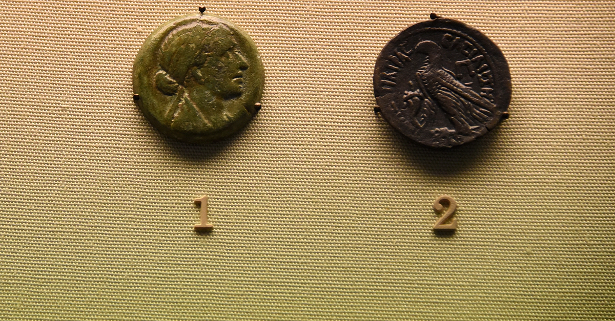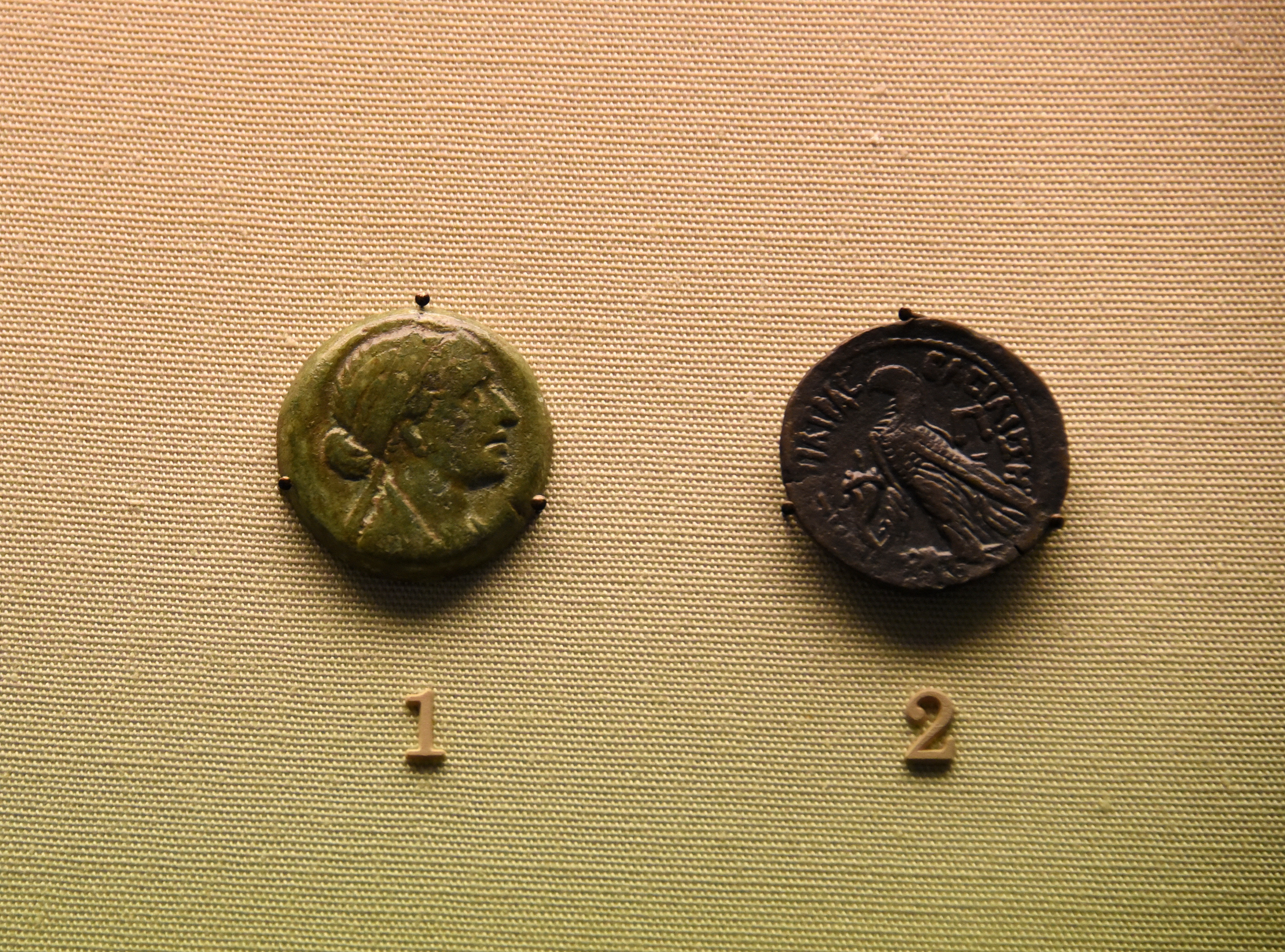 Bronze coin of Cleopatra (r. 51-30 BCE), with her portrait and eagle on the reverse. Minted in Alexandria, in modern-day Egypt. (The British Museum, London).