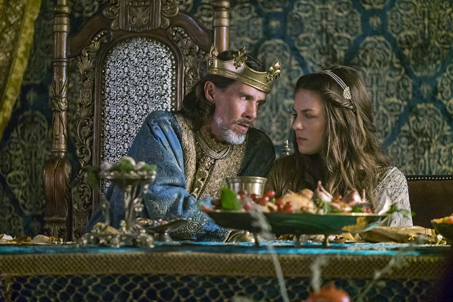Lothaire Bluteau as Charles of West Francia and Morgane Polanski as Gisela of France in the TV series Vikings. The Charles character is an amalgamation of the historical kings of West Francia, Charles the Bald, Charles the Simple and Charles the Fat. Photo by Bernard Walsh/HISTORY - © 2016 The HISTORY Channel