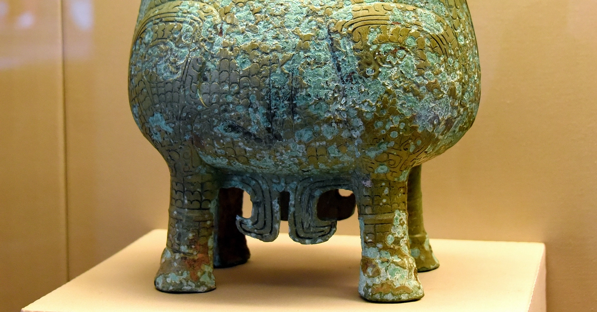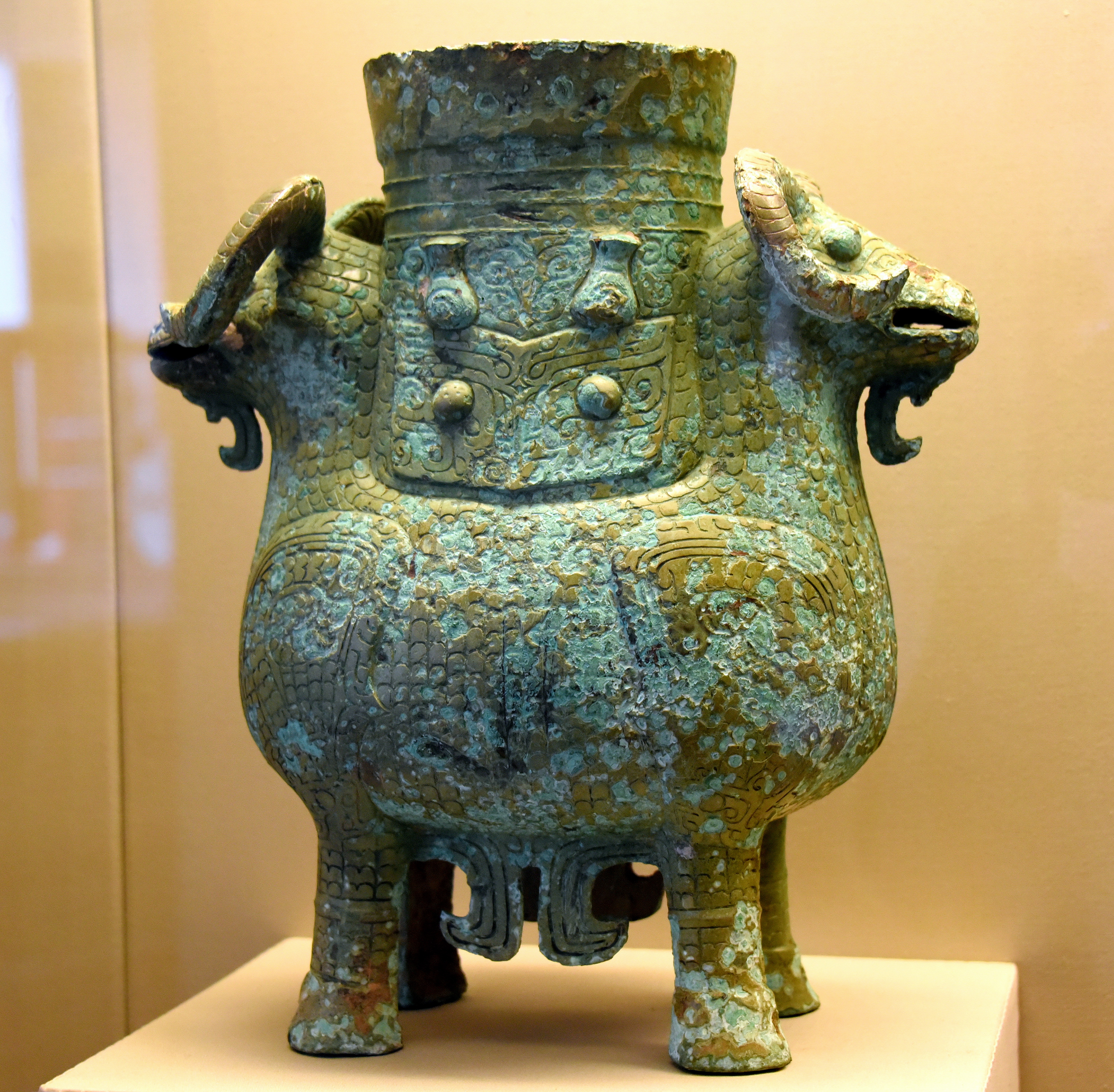 This container, presumably for wine, is flanked by the heads and forequarters of two rams. The rams are very lifelike and this realistic style of decoration suggests it might have been made in Hunan province. Shang Dynasty, 13th to 12th century BCE. From modern-day China. (The British Museum, London).