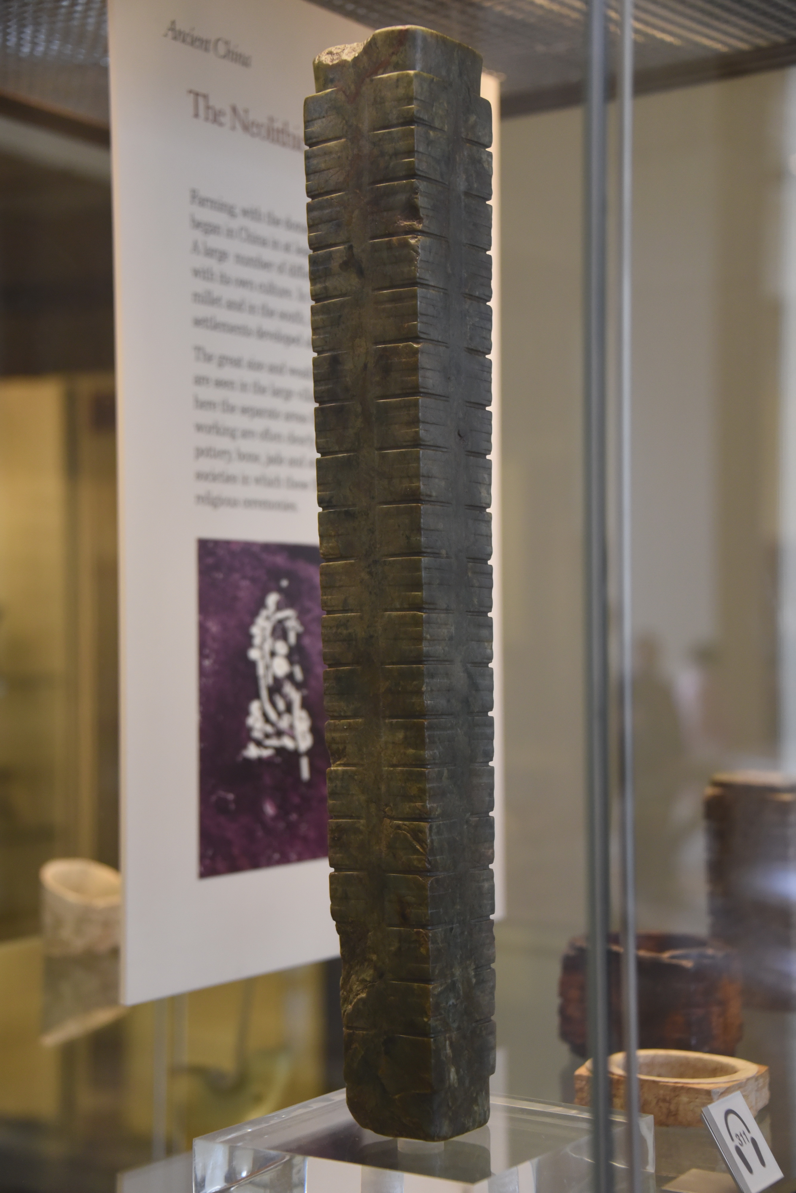 Cong is the name given to a type of jade of unknown purpose, found in burials of the Neolithic period in Southeast China. The Cong has a square cross-section with a cylindrical hole. Congs are often decorated at the corners with faces, each shown with simple eyes; the two horizontal bars above representing the hairline and a shorter bar below for the nose. This is one of the tallest surviving Congs. Liangzhu culture, 2500 BCE. From modern-day China. (The British Museum, London).