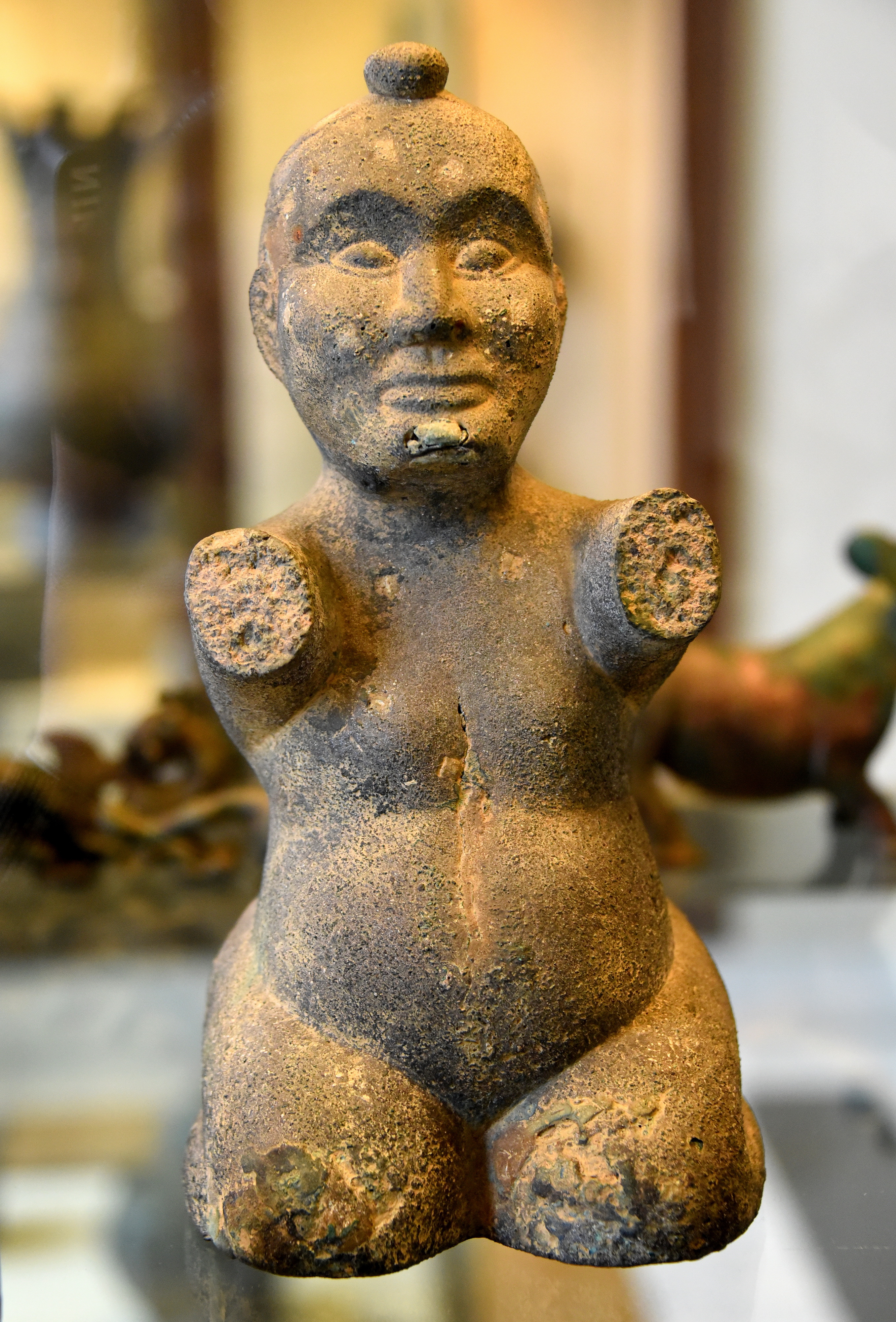 Though similar to small castings found in the provinces of Southeast China, including Guanxi, such figures have been found in royal tombs in the North and may represent tribute bearers. Han Dynasty, 206 BCE to 200 CE. From modern-day China. (The British Museum, London).