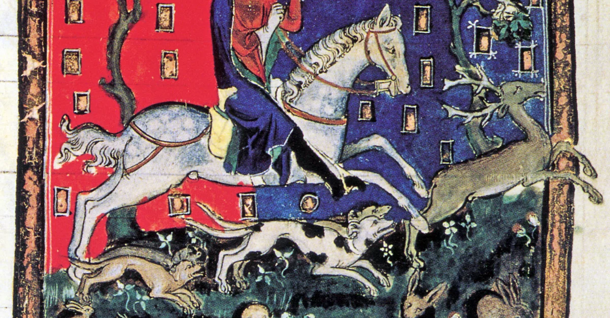 A 14th century CE manuscript illustration showing King John of England (r. 1199-1216 CE) hunting. 'De Rege Johanne', folio 116. (British Library, London)