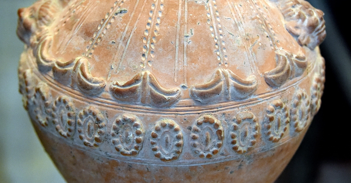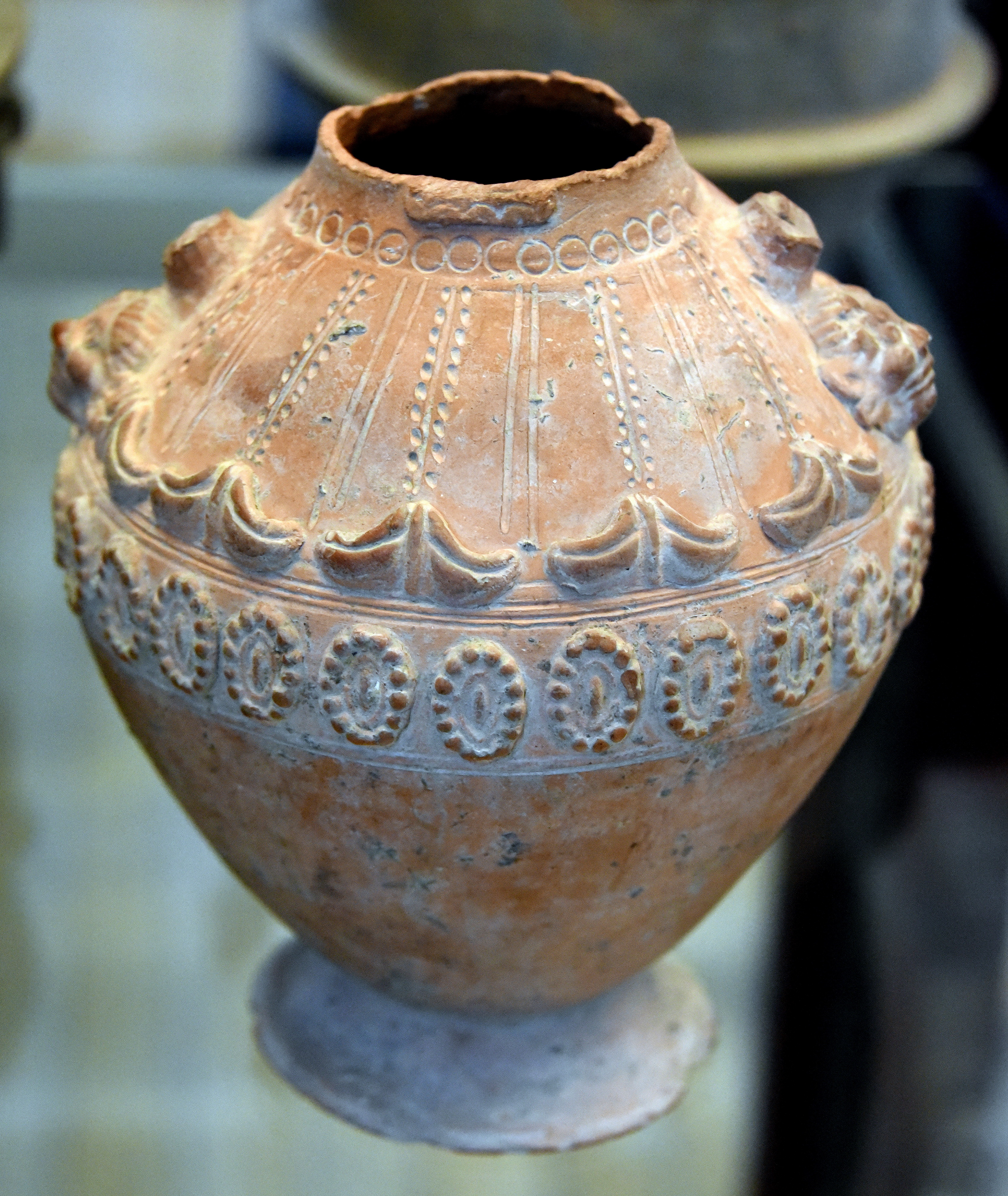 Pottery amphora with applied jewel motifs and grotesque heads; neck and hands are missing. During the South and Northen dynasties, this jewel motif and other applied designs were adopted by Chinese potters further east for use in glazed ceramics. From Yotkan, capital of the kingdom of Khotan, modern Xingjian province, 1st to 3rd century CE. (The British Museum, London).