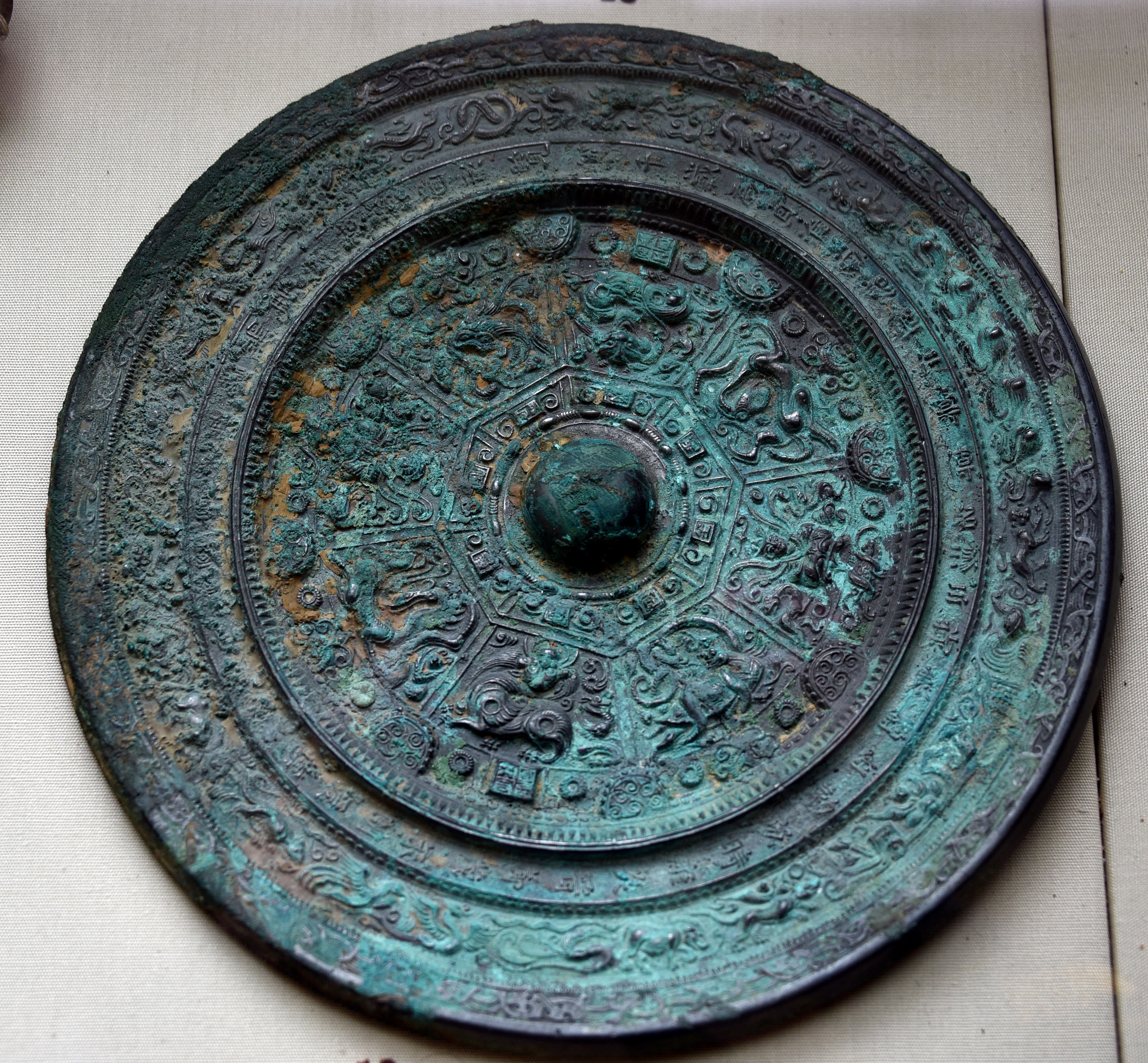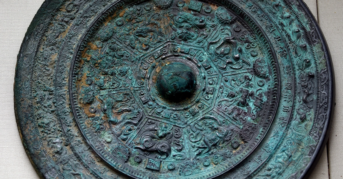This bronze mirror is decorated with figures of Xi Wang Mu, the Queen Mother of the West, and her consort, Dong Wang Gong, as well as animals of the four directions and other creatures. Inscribed around the edge is a poem proclaiming prosperity and wellbeing with hopes for eternal brightness and everlasting spring. Such images are metaphors for immortality. Six Dynasties period, 5th to 6th century CE. From modern-day China. (The British Museum, London).