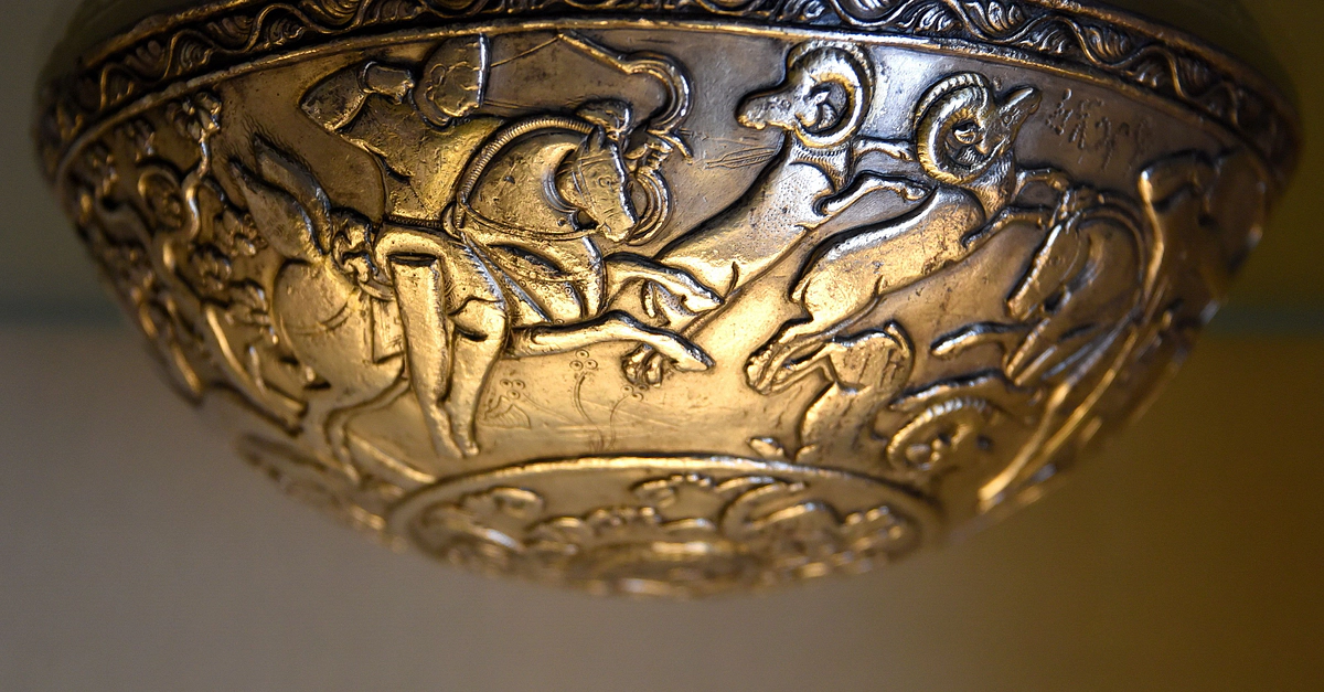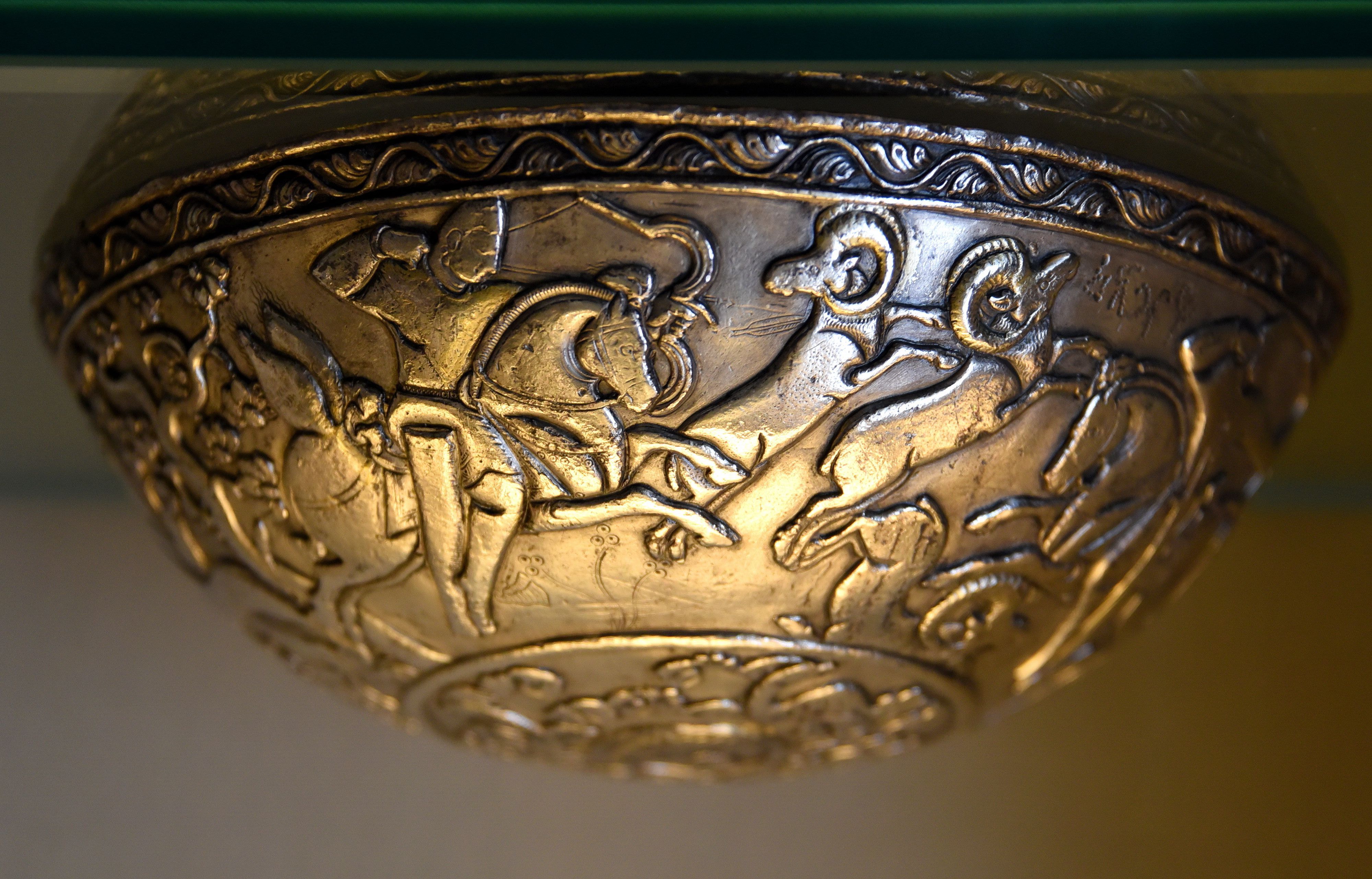 The external surface of this thick-walled silver bowl was inscribed and decorated with a central male figure surrounded by four hunters; two hunters wear crowns similar to last Kidarite coins. It was originally gilded. Hephthalite period, 5th to 6th century CE. From Swat District, in modern-day Pakistan.