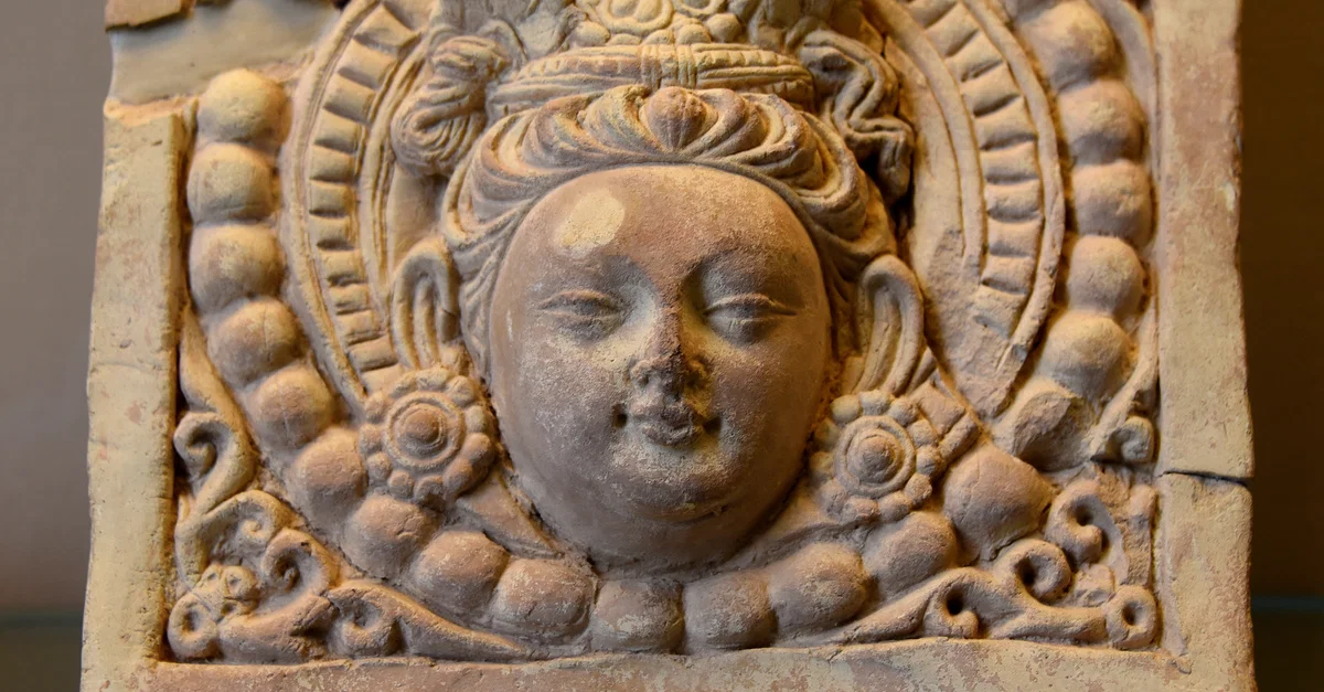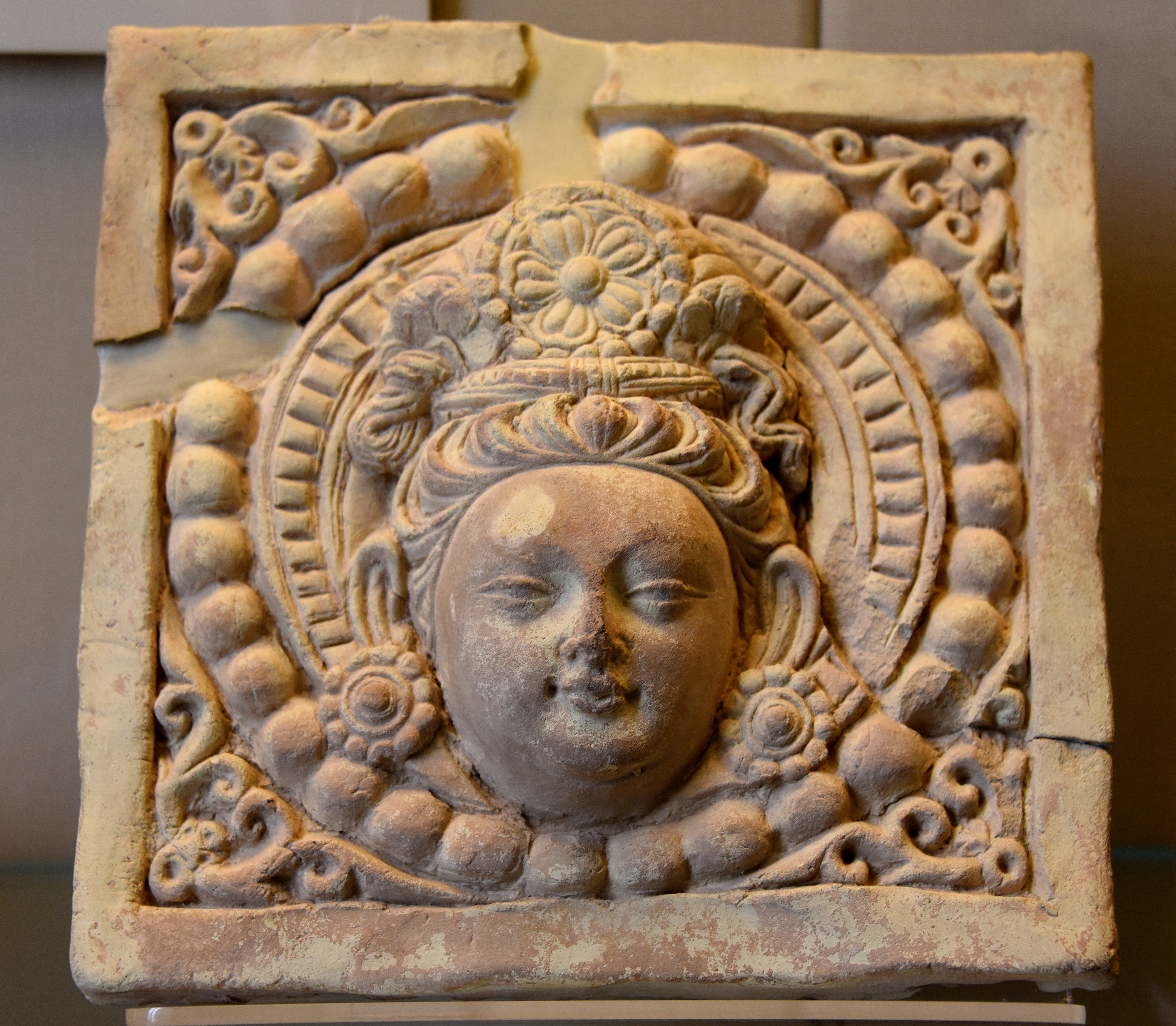 This stucco plaque shows the head of Bodhisattva surrounded by a beaded border. From Ming-oi, near Shorchuk, in modern-day China. 6th to 7th century CE. (The British Museum, London).