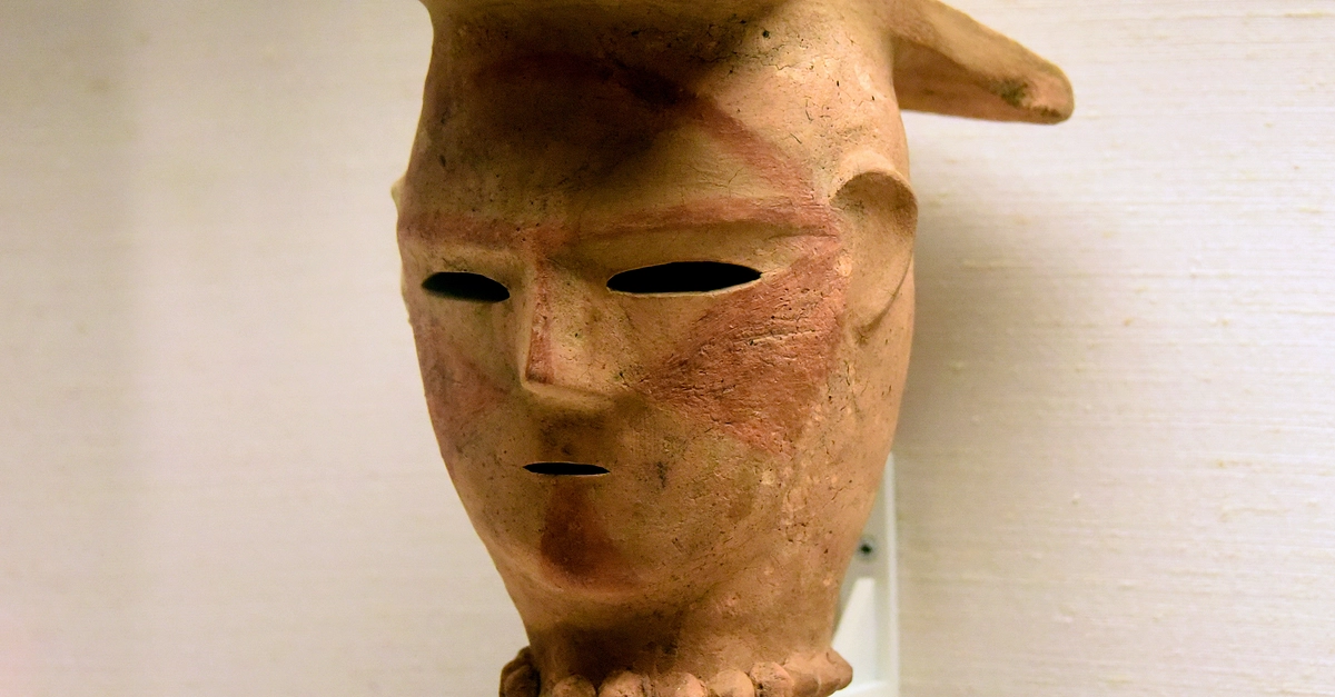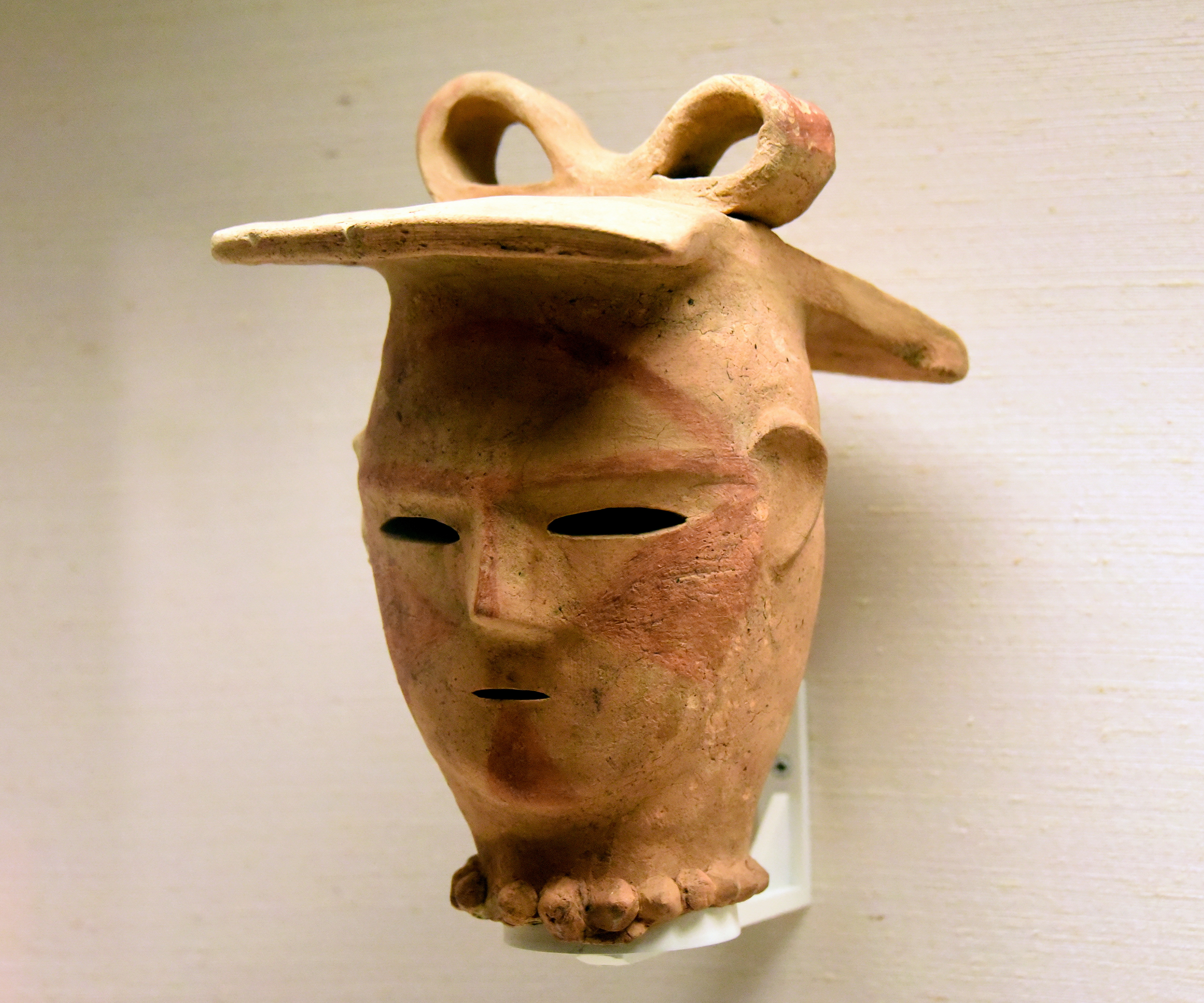This is the head from what was originally a complete figure. The young woman's hair is tied in loops, her face is partly painted red, and she wears a bead necklace. This suggests that she may be a performer of a ritual dance or a shaman. The "haniwa" is said to come from Naka-cho, Higashi Ibaraki-gun, Ibaraki prefecture, eastern Japan. Terracotta, earthenware, handmade technique. Made in Japan, c. 500s CE. (The British Museum, London).