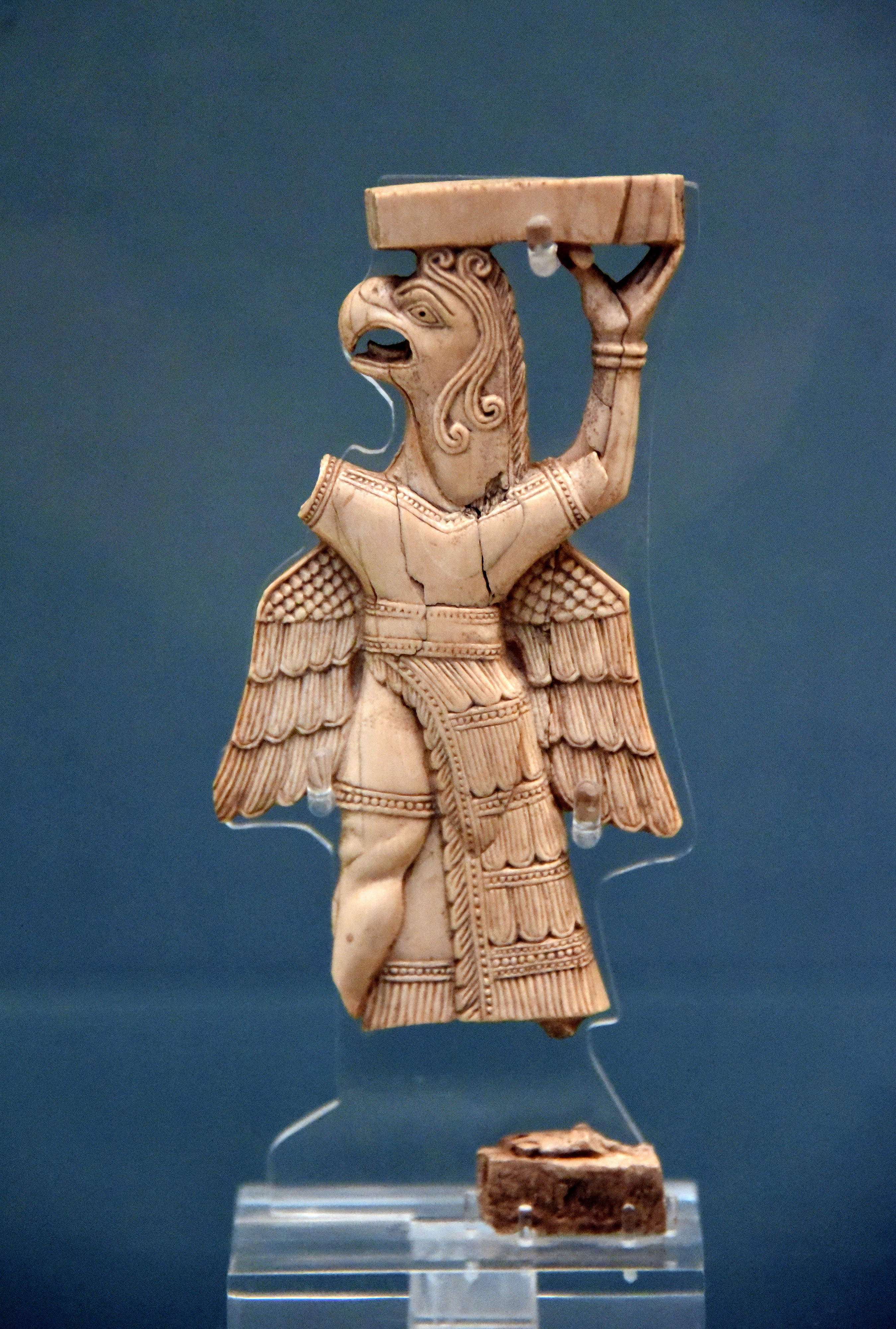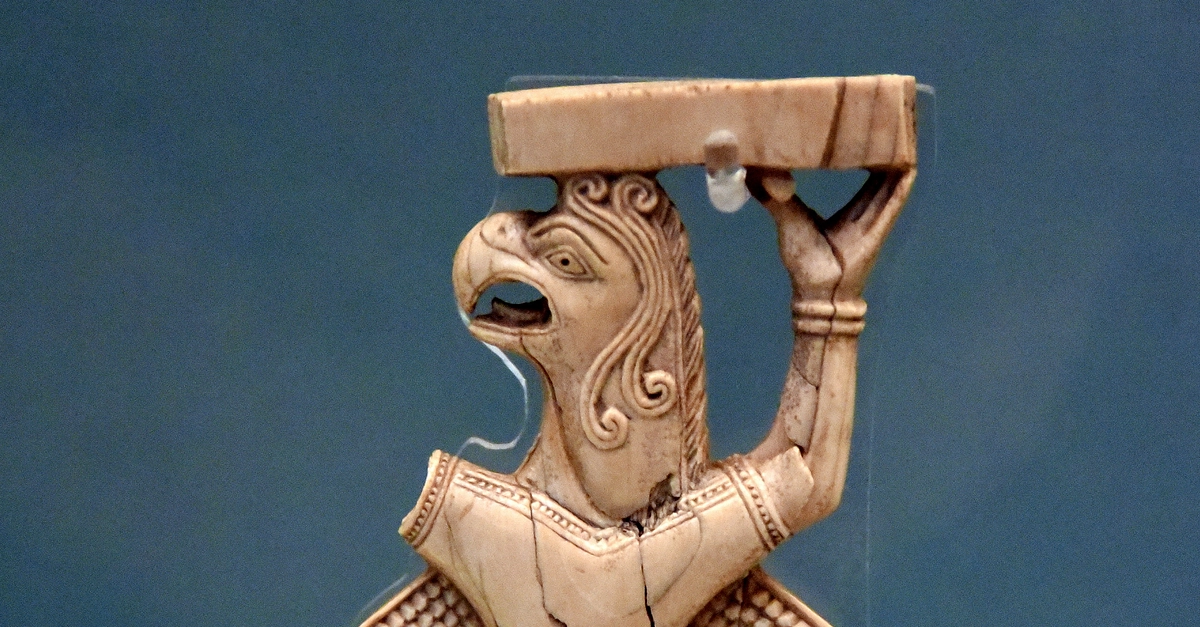 This is a griffin-headed demon of white ivory. Both arms are raised (the right is lost), probably to support a throne. From Toprakkale, Eastern Anatolia, in modern-day Turkey. Urartian, 8th to 7th century BCE. (The British Museum, London).