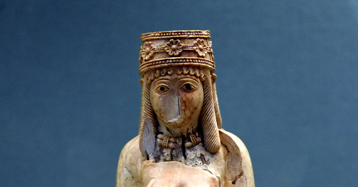 This ivory figure depicts a nude woman wearing an elaborate headgear and necklace. Excavated by E. Clayton and G. C. Raynolds. From Toprakkale, Eastern Anatolia, in modern-day Turkey. Urartian, 8th to 7th century BCE. (The British Museum, London).