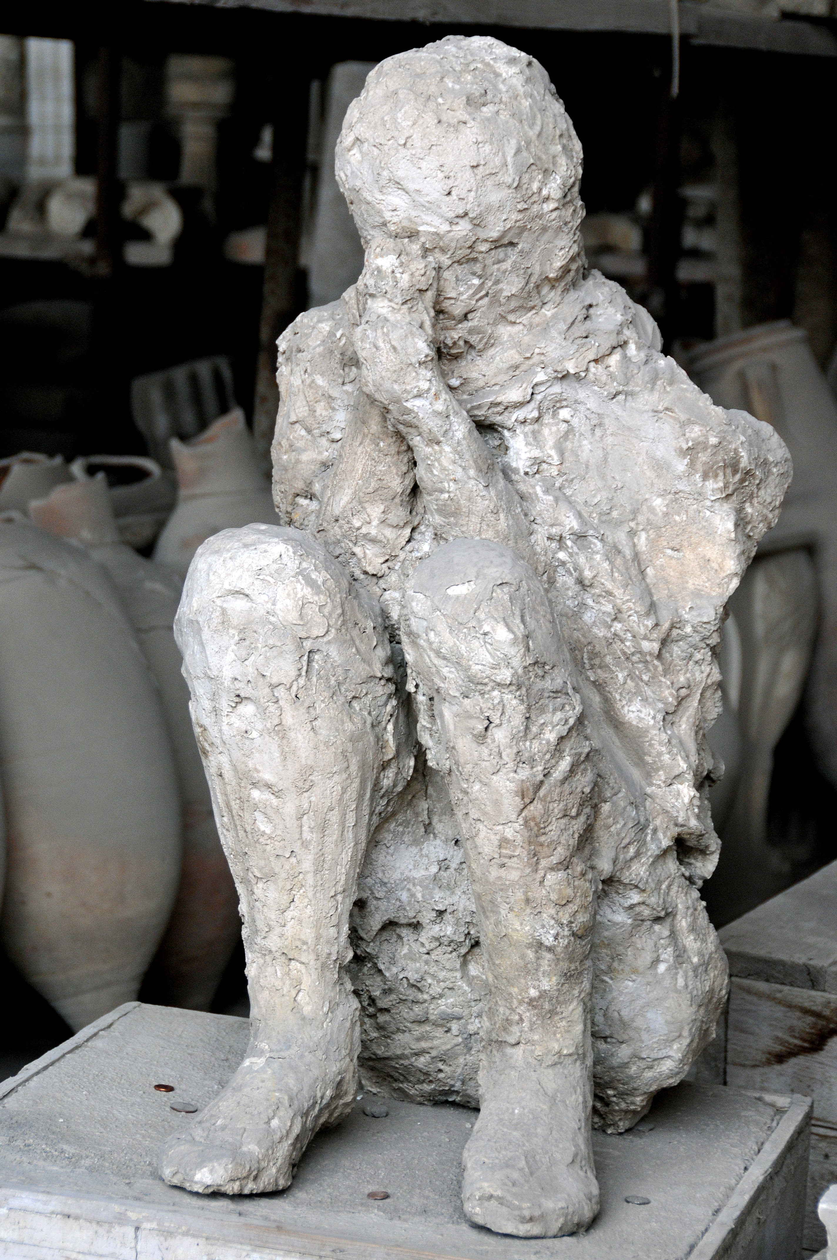 A cast of the 'muleteer', a victim of the eruption of Vesuvius which completely covered Pompeii in 79 CE. The poisonous and super-heated gas cloud which struck Pompeii following the initial ash fall-out asphyxiated and baked any remaining people in the town. This victim was discovered near a skeleton of a mule under a porticoe of the Palaestra.