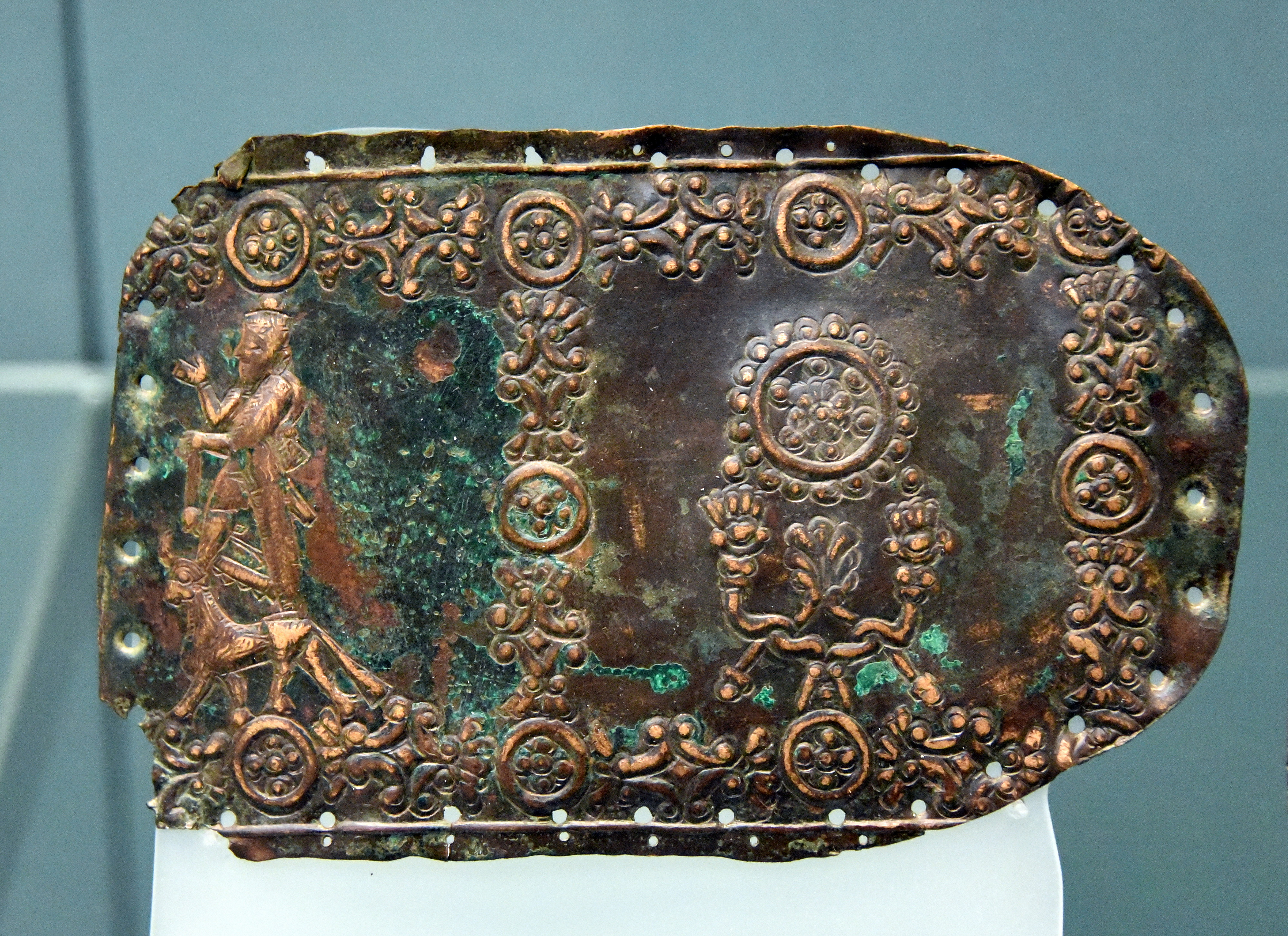 This fragment from a bronze belt was reused as a belt end. The embossed or chased design is divided by discs and scroll-crosses into panels with discs above stylised trees. A deity stands on a bull. The holes around the edge are for nails or stitching. From Eastern Anatolia, in modern-day Turkey. Urartian, 7th century BCE. (The British Museum, London).