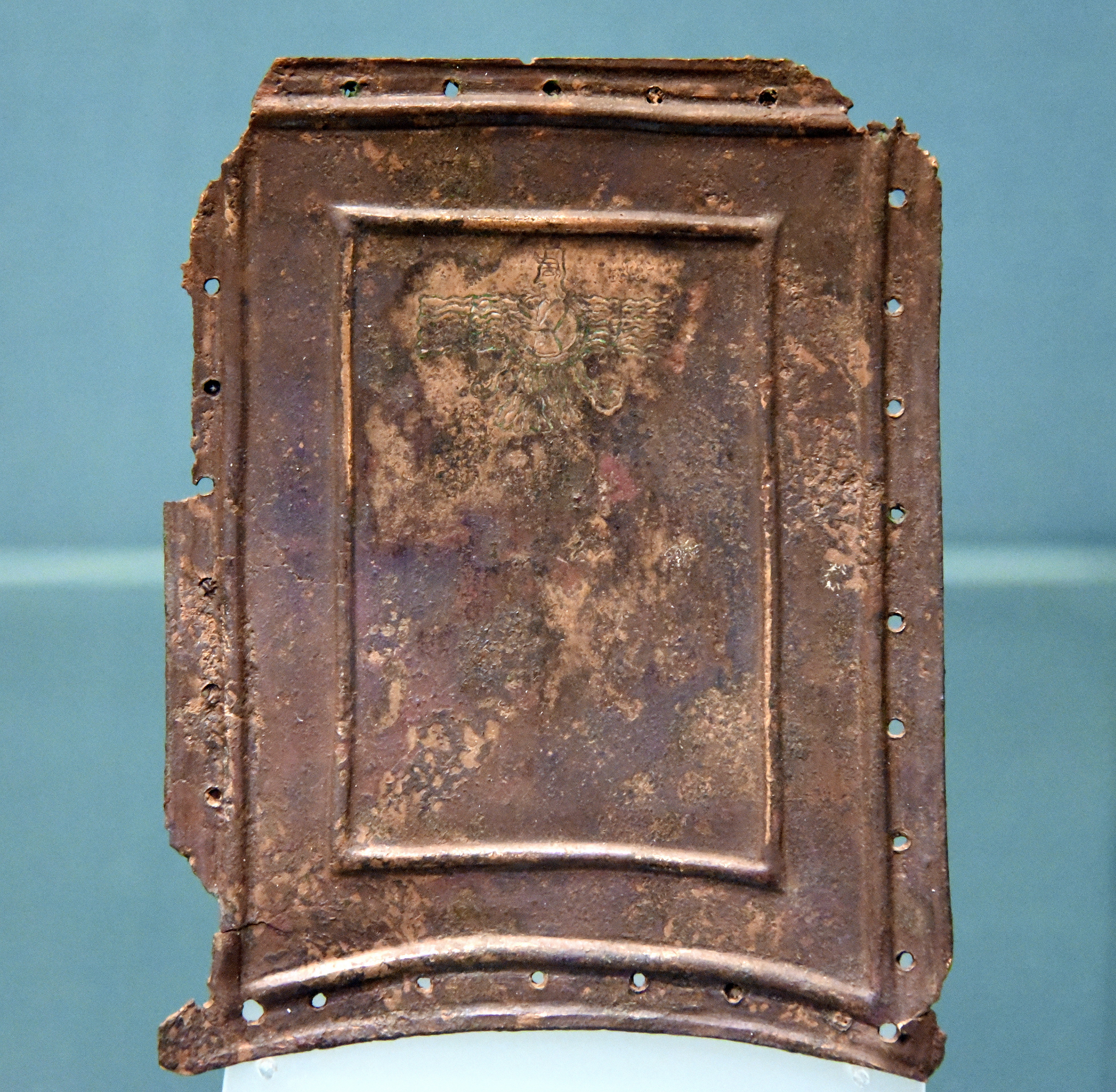 This bronze plaque is engraved, at the upper part, with a figure of a god in a winged sun-disc. Originally, this plaque was part of a horse-harness (side-piece ), which was stitched to a leather backing. From Eastern Anatolia, in modern-day Turkey. Urartian, 9th to 8th century BCE. (The British Museum, London).
