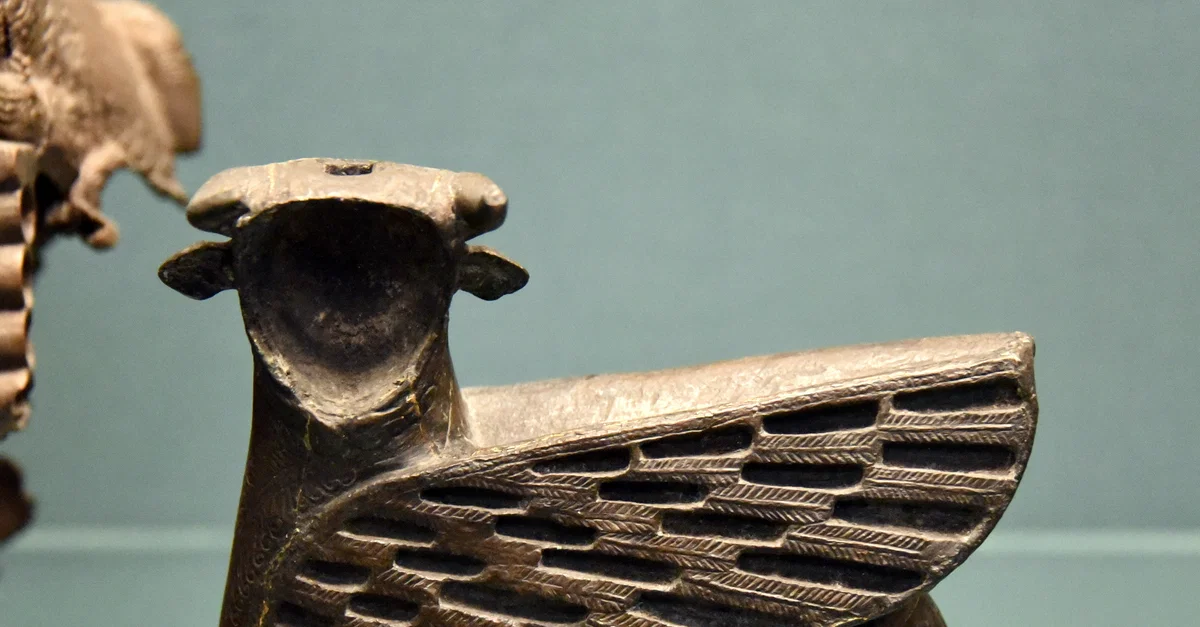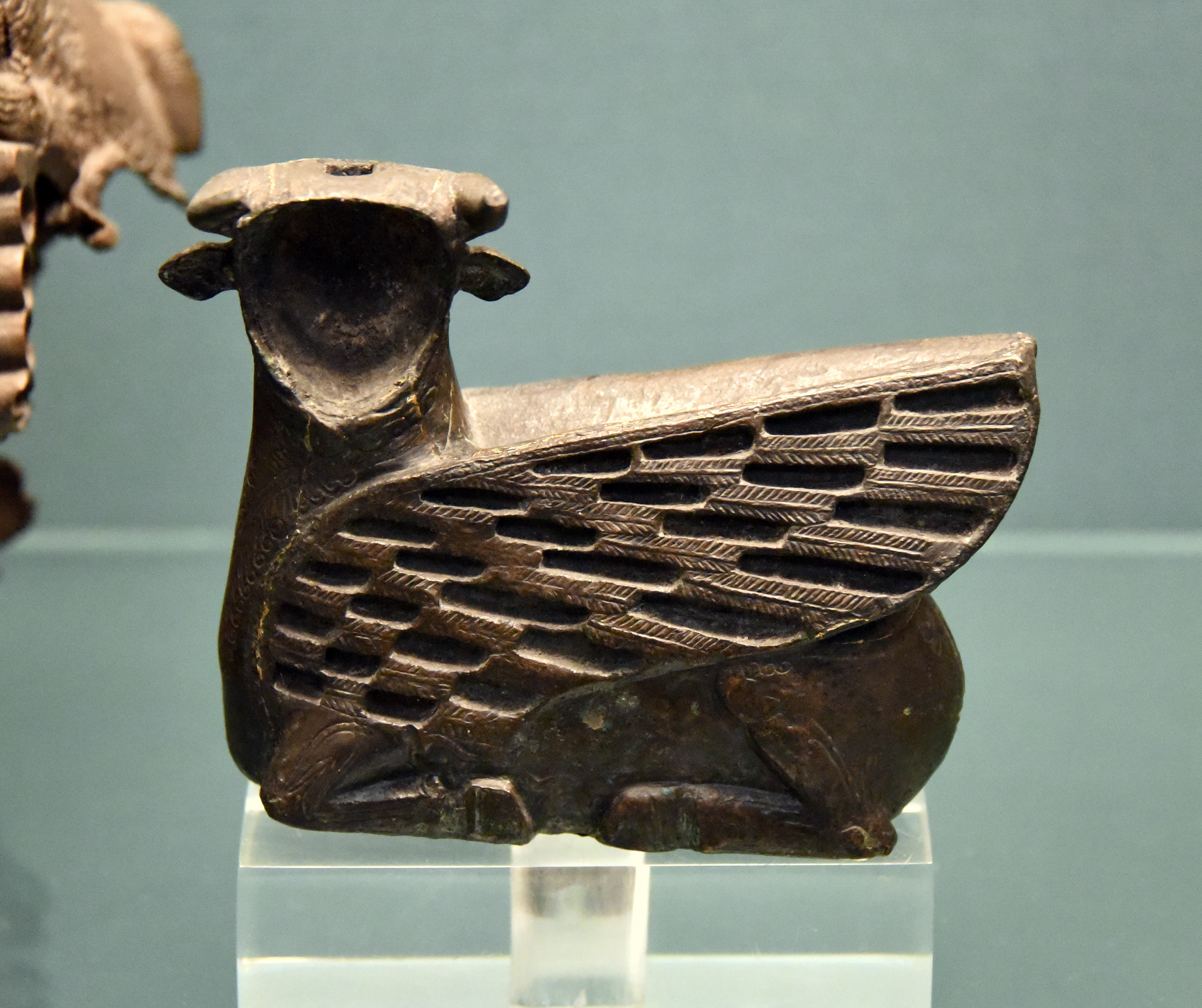 This is a bronze furniture-fitting (probably of a stool) of a kneeling or a recumbent winged-bull. It was originally inlaid and gilded. There is a dowel for attachment at the lower surface. From Toprakkale, Eastern Anatolia, in modern-day Turkey. Urartian, late 8th century BCE. (The British Museum, London).