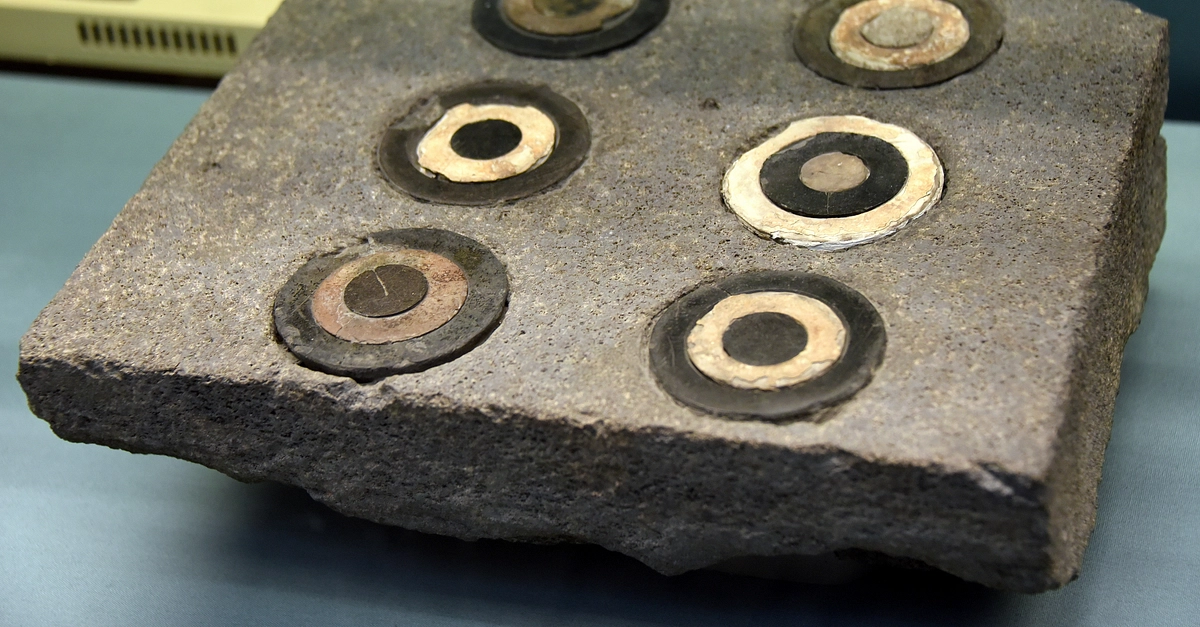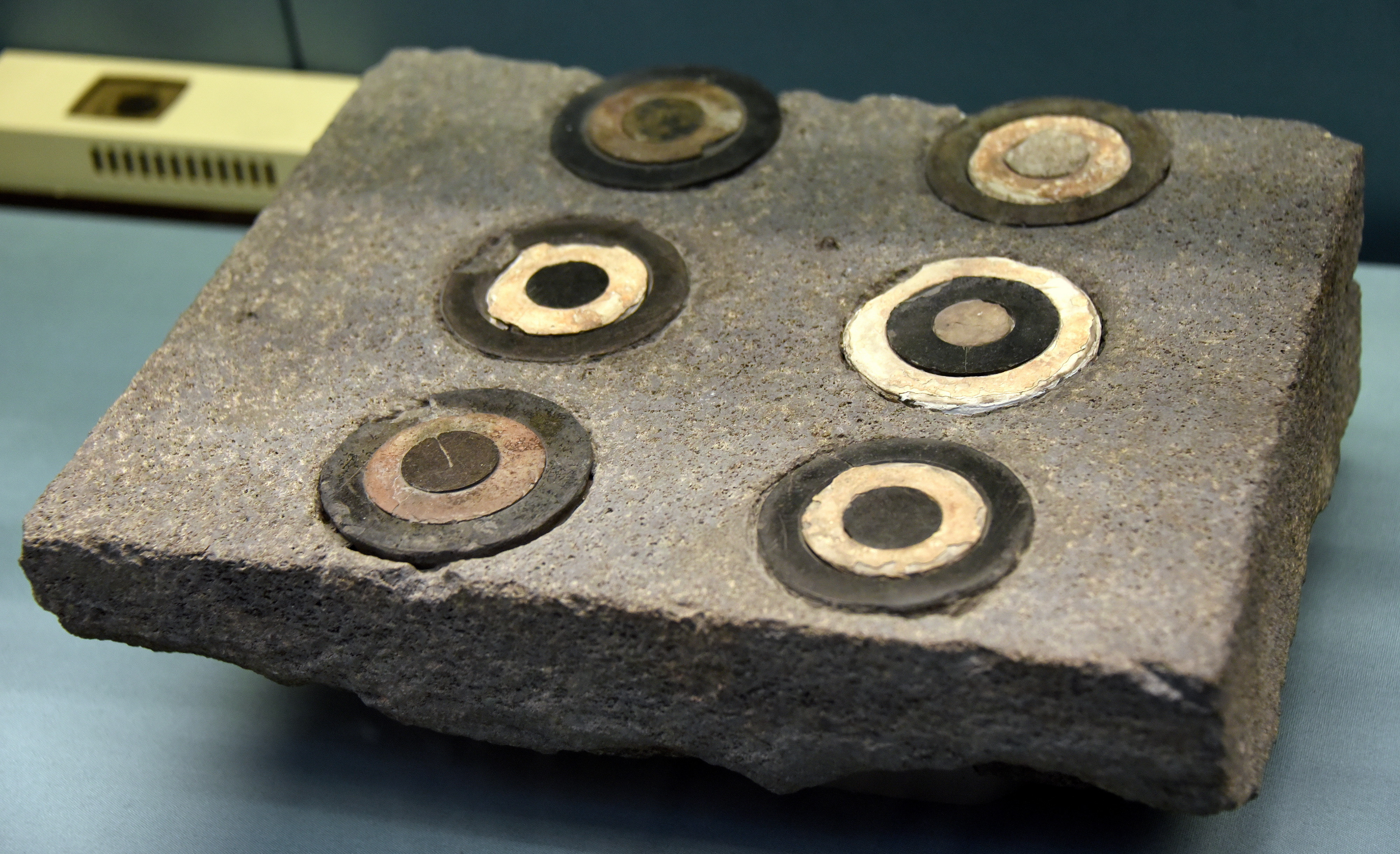 This slab (which is inlaid with black and white stone) was part of the paved platform in front of the temple of the god Haldi, the supreme god of the Urartians. The rings were carefully slotted together and secured by a pin so the top would remain flat. From Toprakkale, Eastern Anatolia, in modern-day Turkey. Urartian, late 8th century BCE. (The British Museum, London).