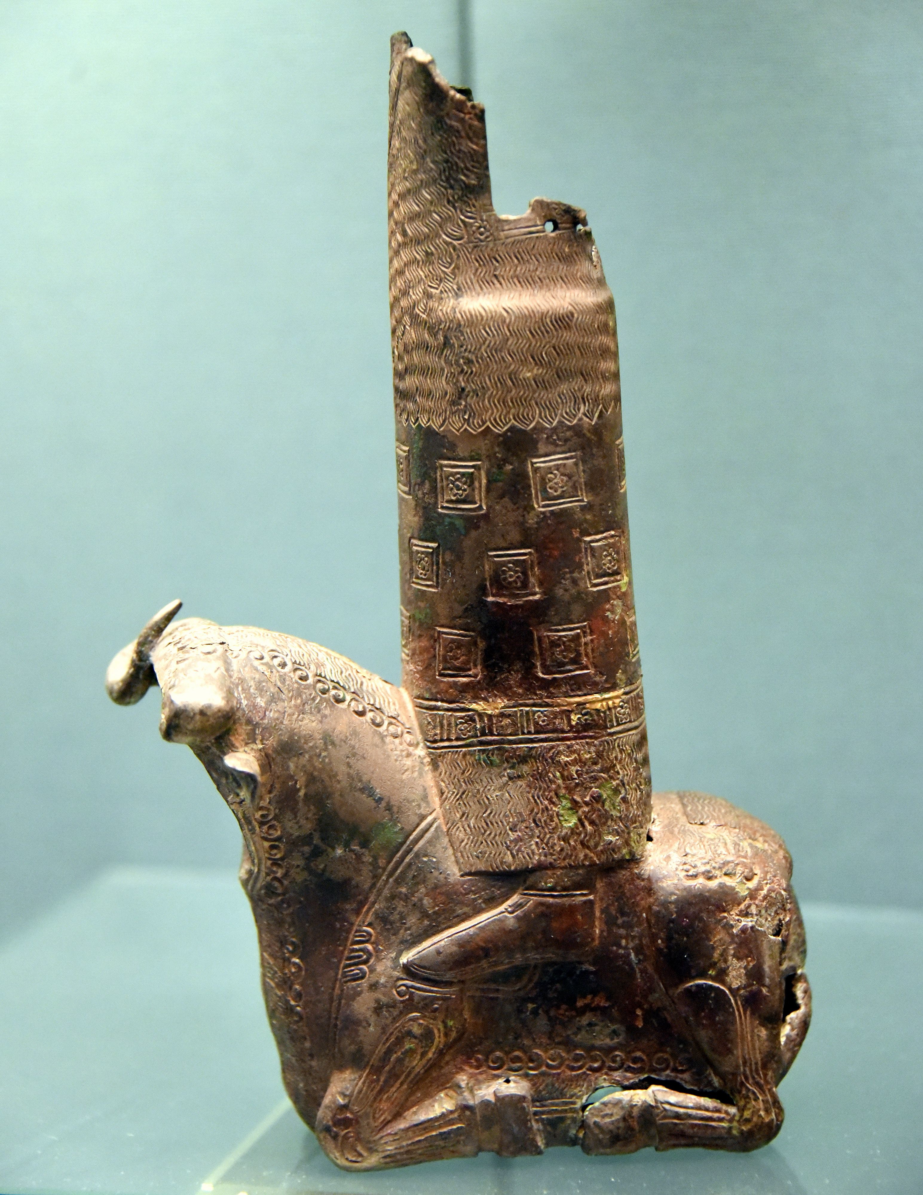 This is a bronze furniture-fitting (probably of a corner of a throne or bed). A god wearing a fringed robe stands on a recumbent bull. It was originally inlaid and gilded. From Toprakkale, Eastern Anatolia, in modern-day Turkey. Urartian, late 8th century BCE. (The British Museum, London).