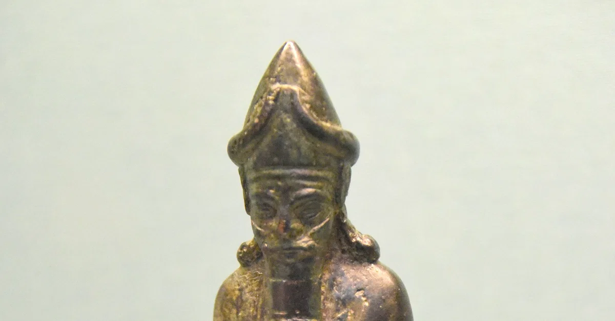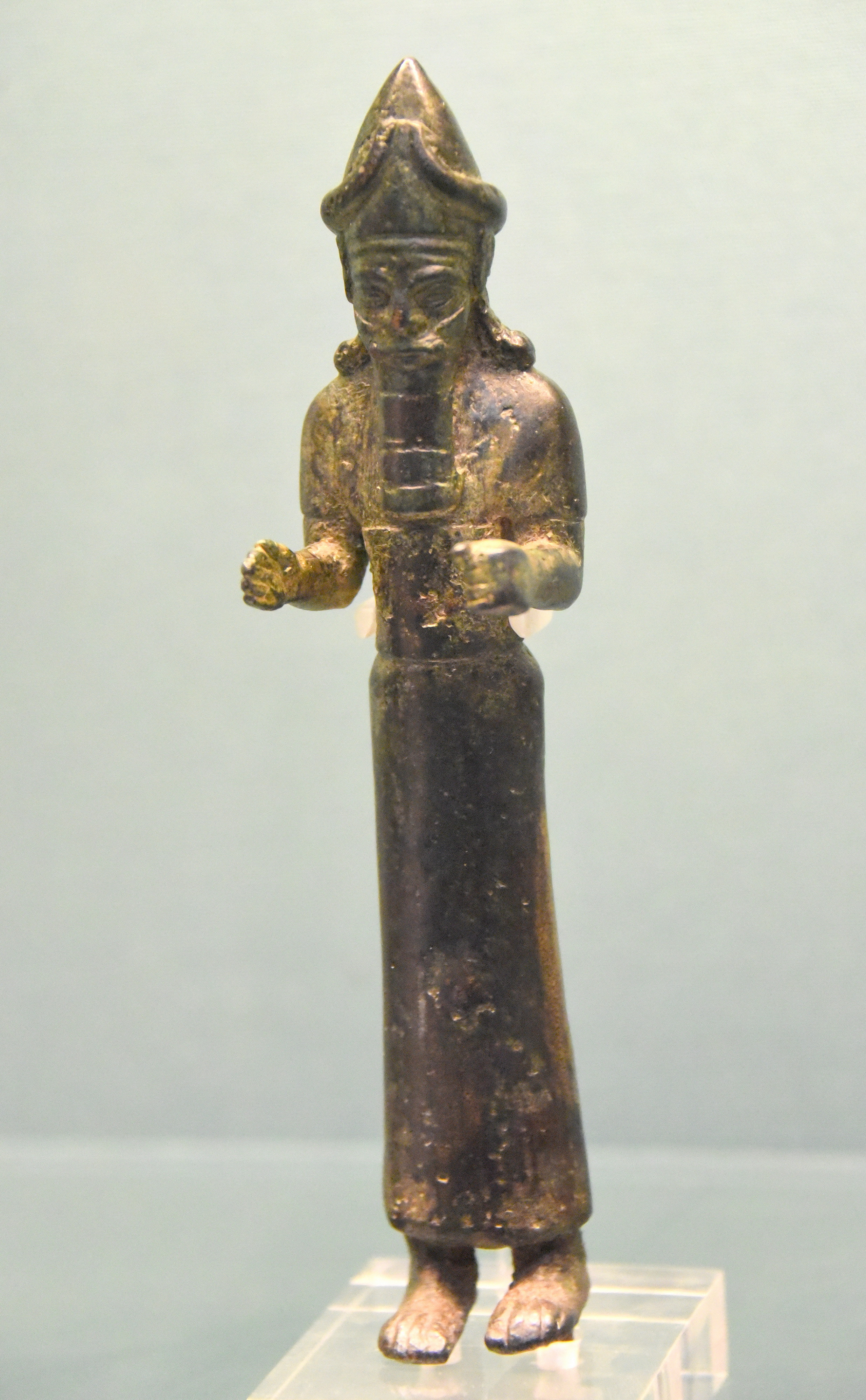 This is a bronze figure of a standing bearded deity. He wears a pointed and horned helmet. His elbows are flexed with fisted hands. From Toprakkale, Eastern Anatolia, in modern-day Turkey. Urartian, 8th to 7th century BCE. (The British Museum, London).