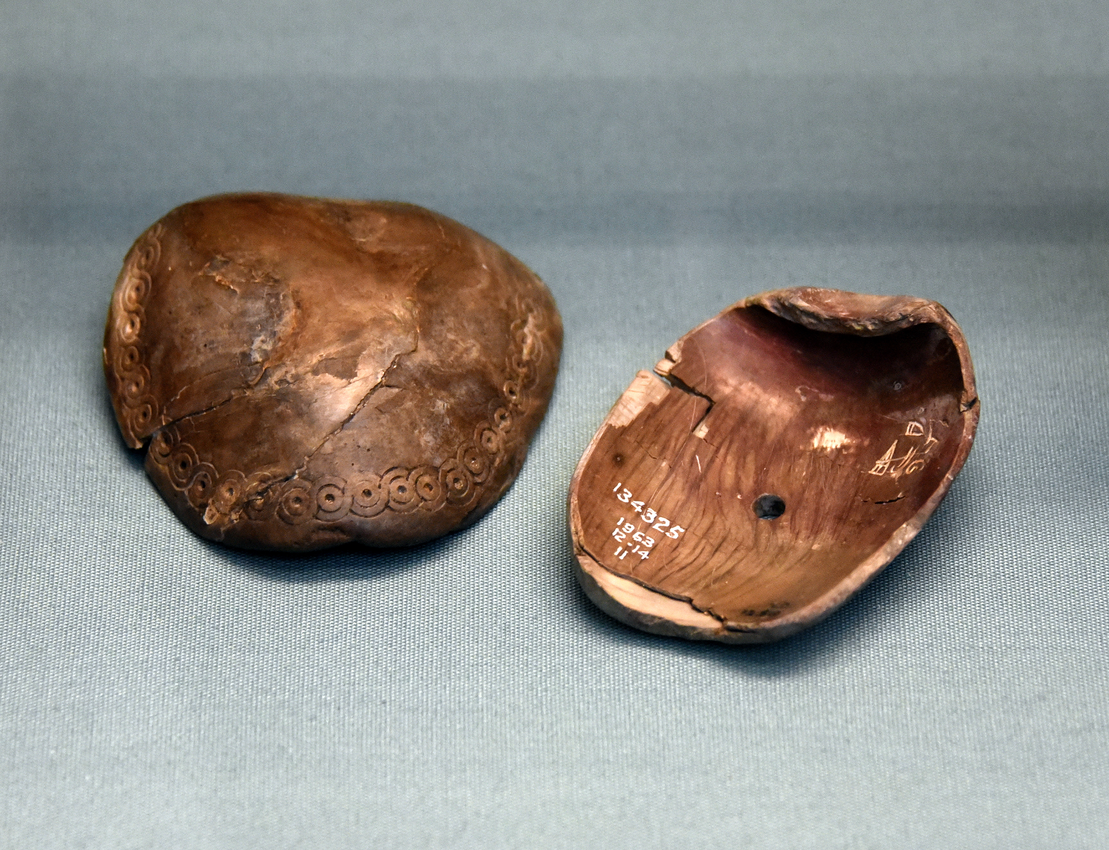 These musical instruments were given to the Assyrian king Shalmaneser III (reigned 858-824 BCE) by the king of Hamath (now Hama) in Syria. His name, Urhilina, appears in Luwian hieroglyphs on the underside of the right shell. The border was incised in a guilloche pattern. From Fort Shalmaneser at Nimrud, in modern-day Iraq. Neo-Hittite period, 9th century BCE. (The British Museum, London).