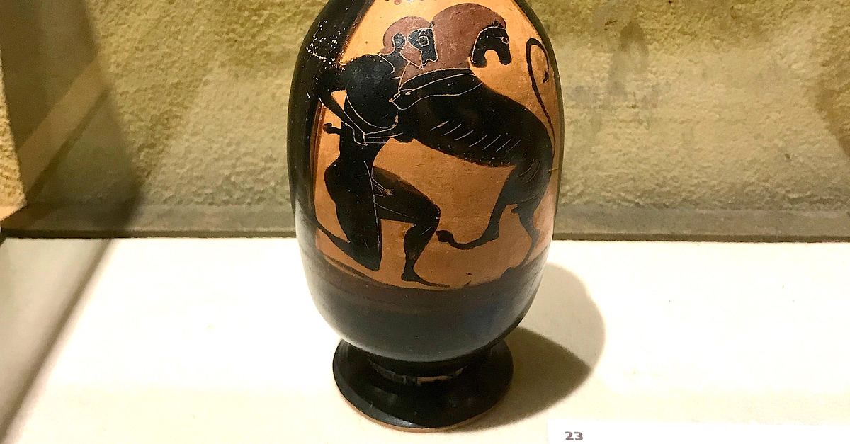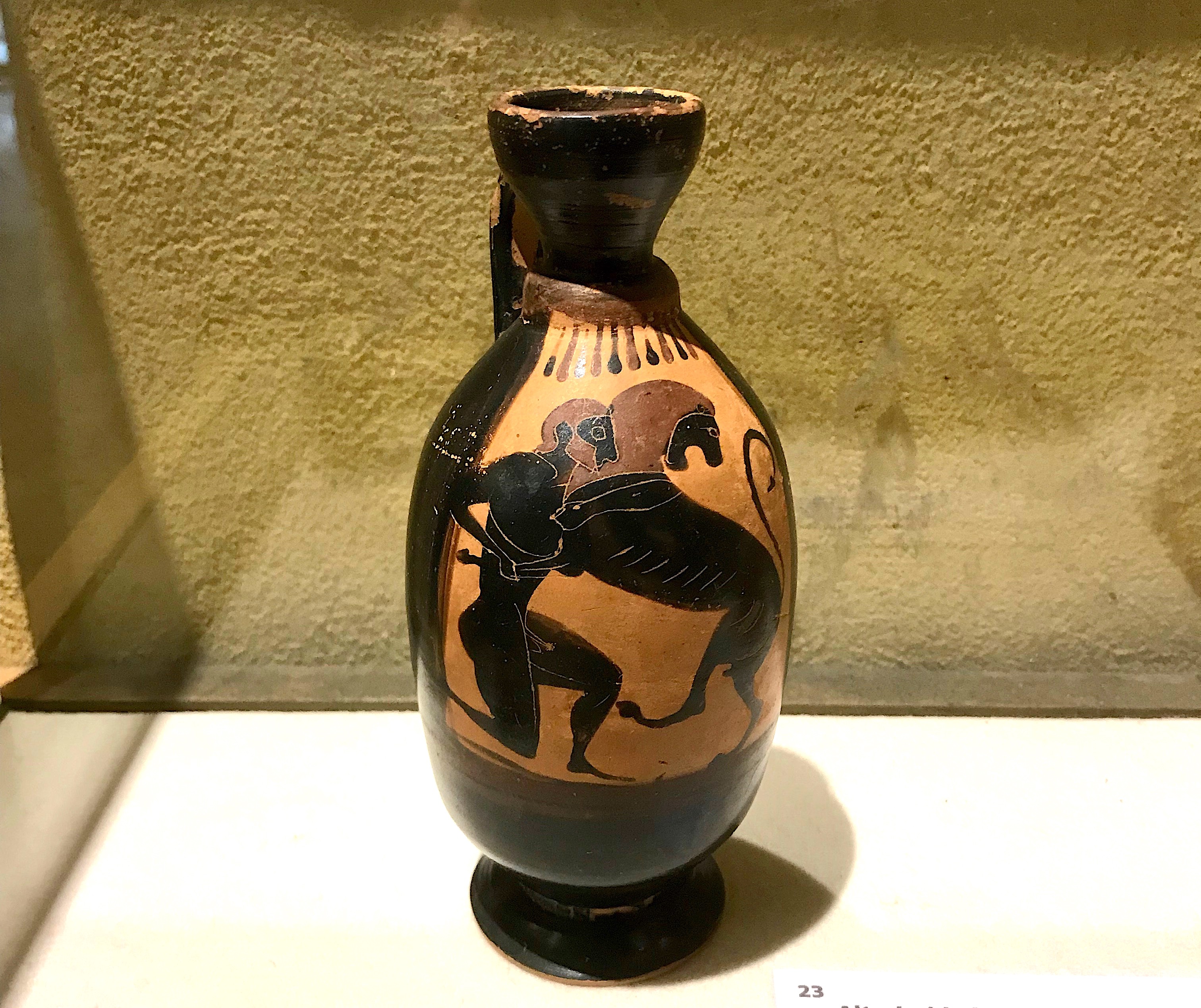 Hercules (or Herakles) fighting the Nemean lion on an ancient Greek clay pitcher in black figure style. In ancient Greek mythology, Hercules defeated the lion of Nemea and took the lion's skin to King Eurystheus. This specimen dates from c. 550 CE and is currently exhibited at the Zürich Zoologischer Garten in Zürich, Switzerland, but it is originally from the Antikenmuseum's collection of antiquities in Basel, Switzerland.