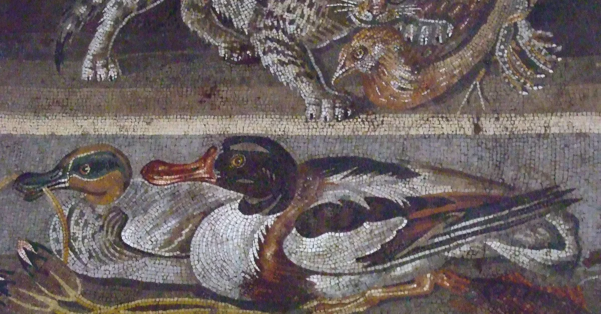 A mosaic from the Roman town of Pompeii, buried by the eruption of Mt. Vesuvius in 79 CE. Such fine mosaics were a common feature of floors in the villas of the town and depicted scenes from mythology, the owner's business interests or, as here, animal scenes. (Archaeological Museum of Naples, Italy).