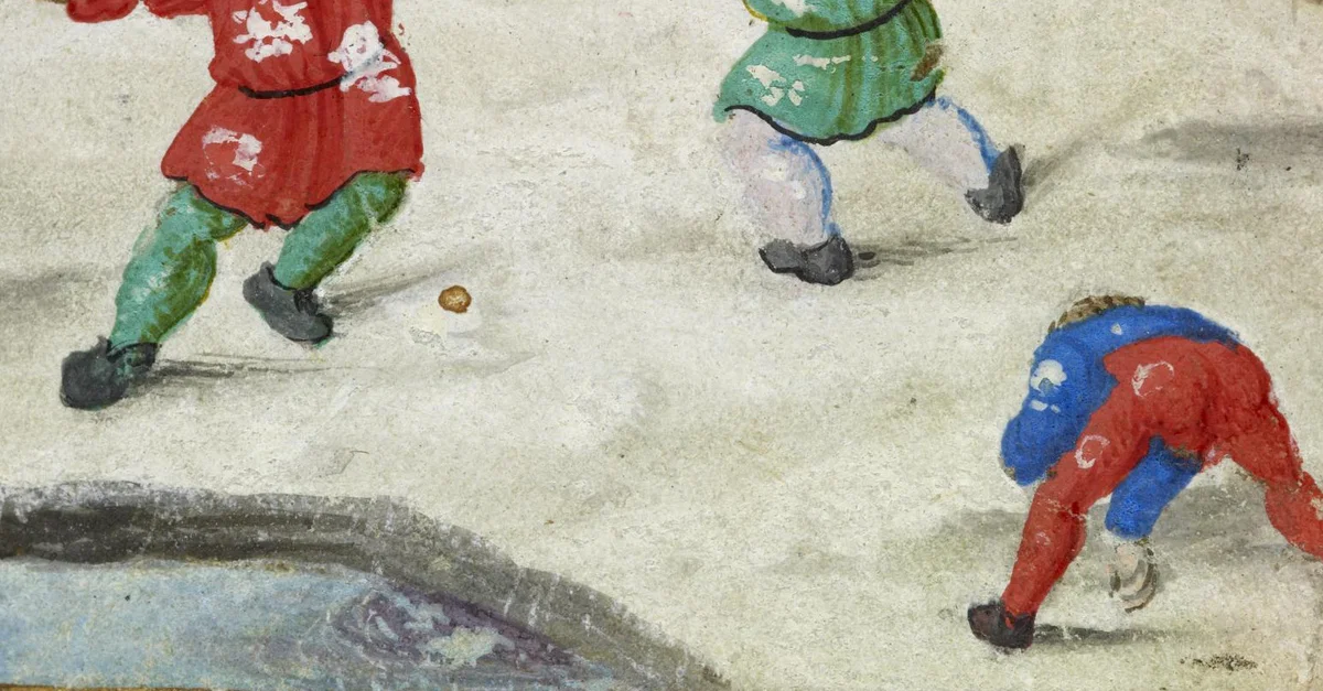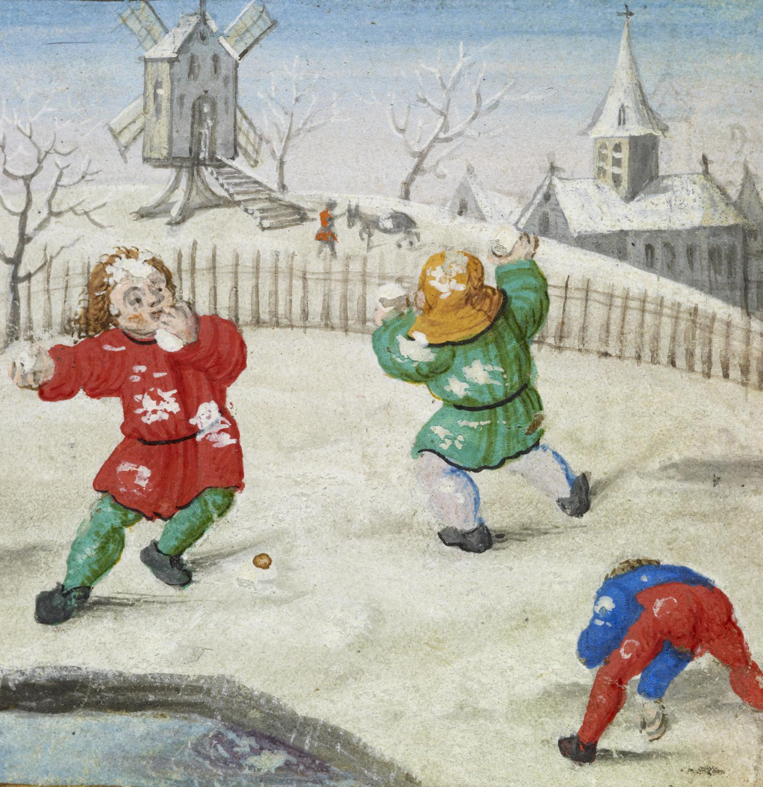 A medieval manuscript illustration showing children having a snowball fight. A Book of Hours, c. 1510 CE. (Walters Art Museum, Baltimore, USA)