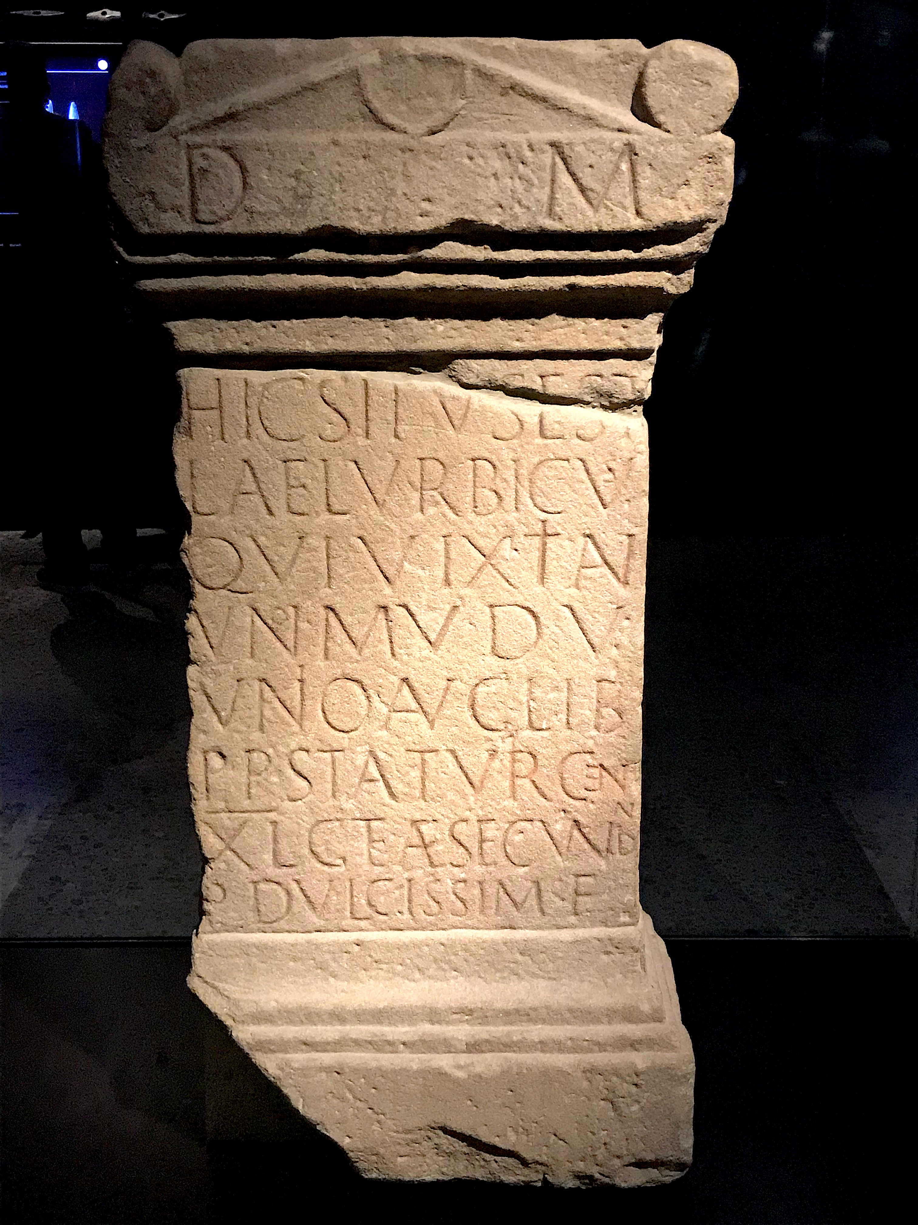A father had this tombstone erected in memory of his little boy Lucius, who had died at the age of two. The inscription in Latin not only mentions the profession of the man, who was head of the Zurich customs post, but also of the Roman name of the city of Zurich: "Turicum." Funerary stela, stone. c. 180 CE. Originally erected in a cemetery and later reused as a building block at Lidenhof in the city of Zurich, Switzerland. (Landesmuseum, Zürich).