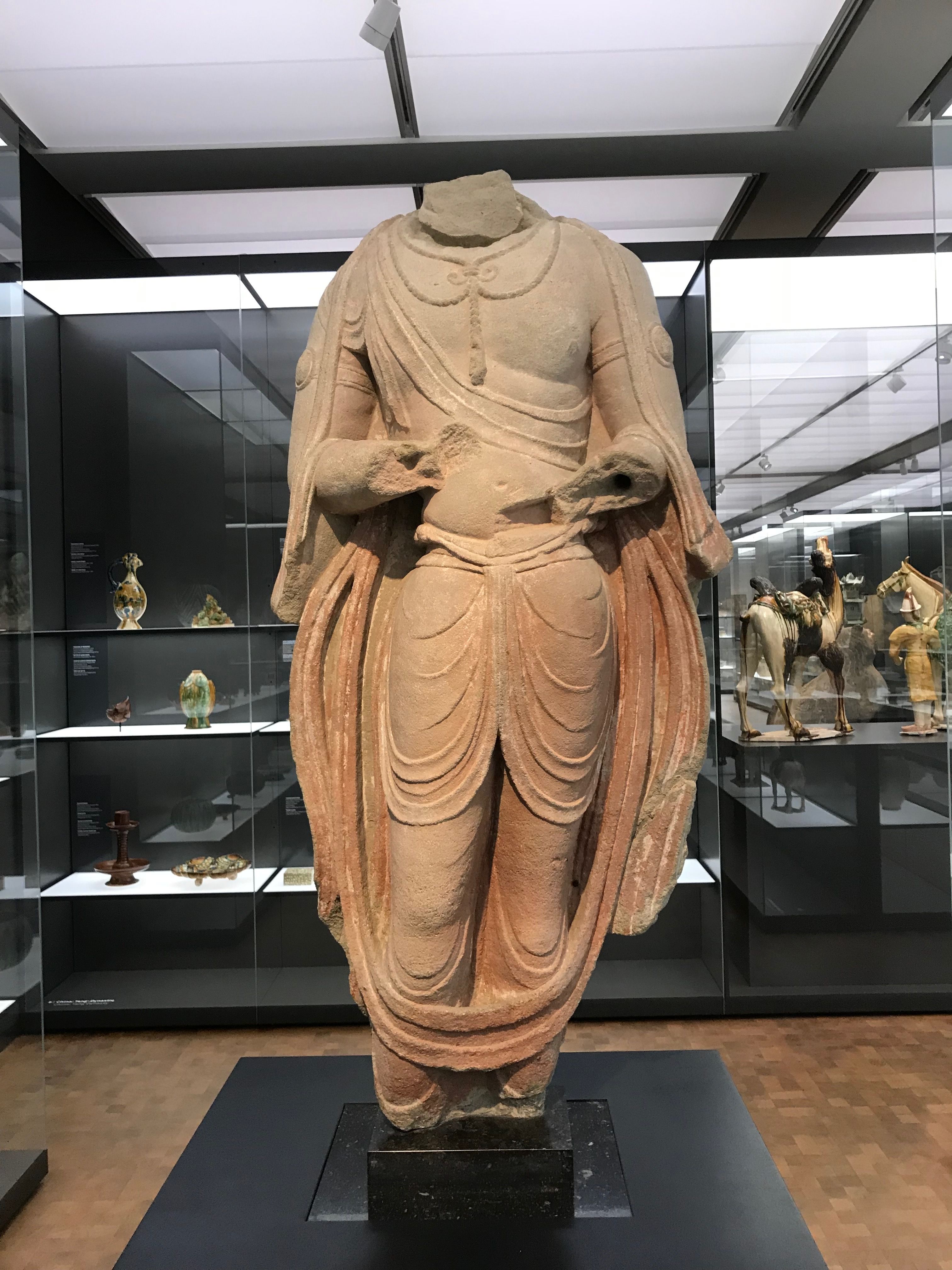 This standing bodhisattva made of Sandstone comes from Cave 14 from the renown temples of Tianlongshan in China's Shanxi province. The influence from Greco-Roman art as well as South Asian art is palpable. It was made during the Tang Dynasty around the year 700 CE. (Museum Rietberg, Zürich).