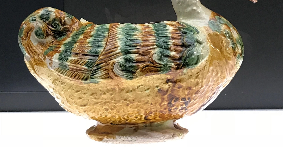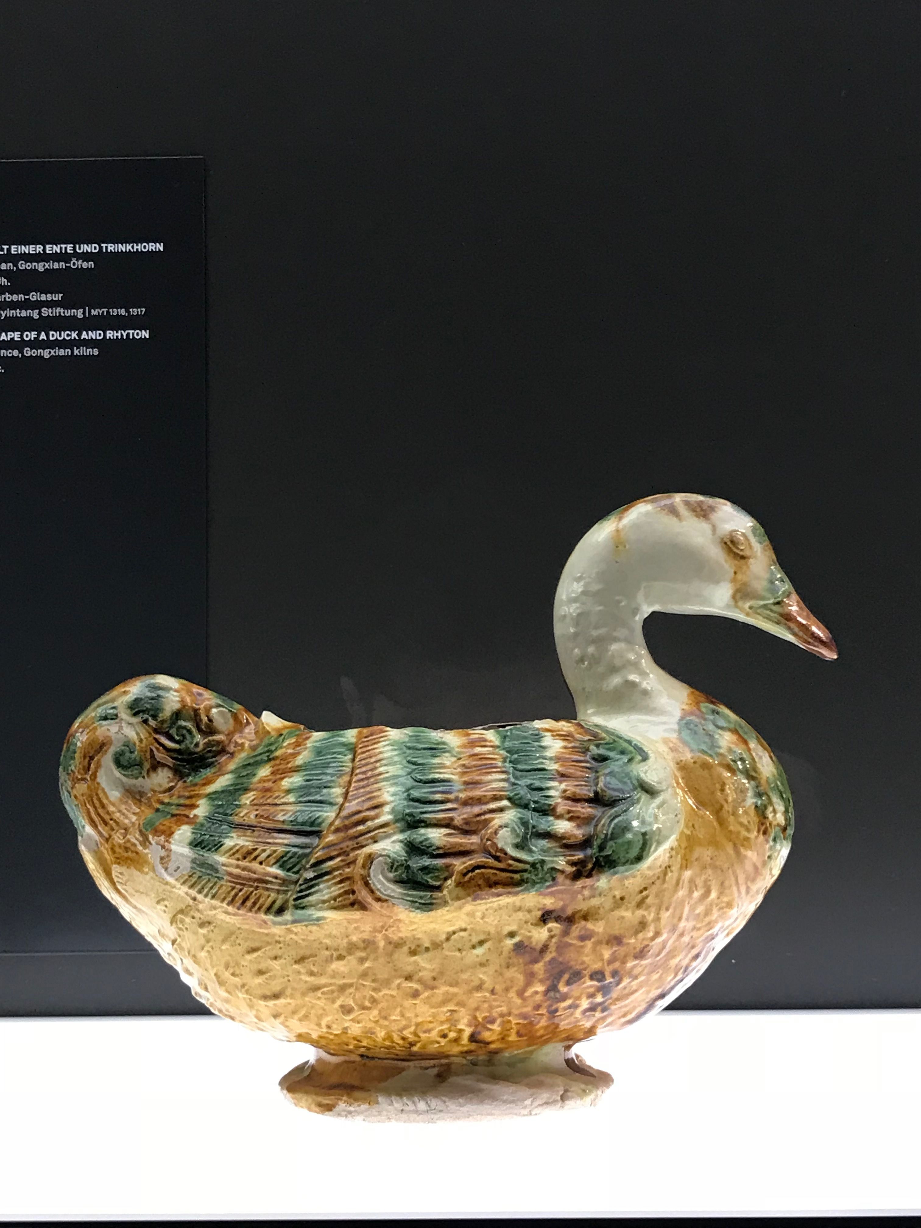 This beautiful vessel in the shape of a duck and rhyton comes from China's Henan province, and it was made at the Gongxian kilns during the Tang Dynasty. It is believed to have been created during the 8th century CE. (Museum Rietberg, Zürich).